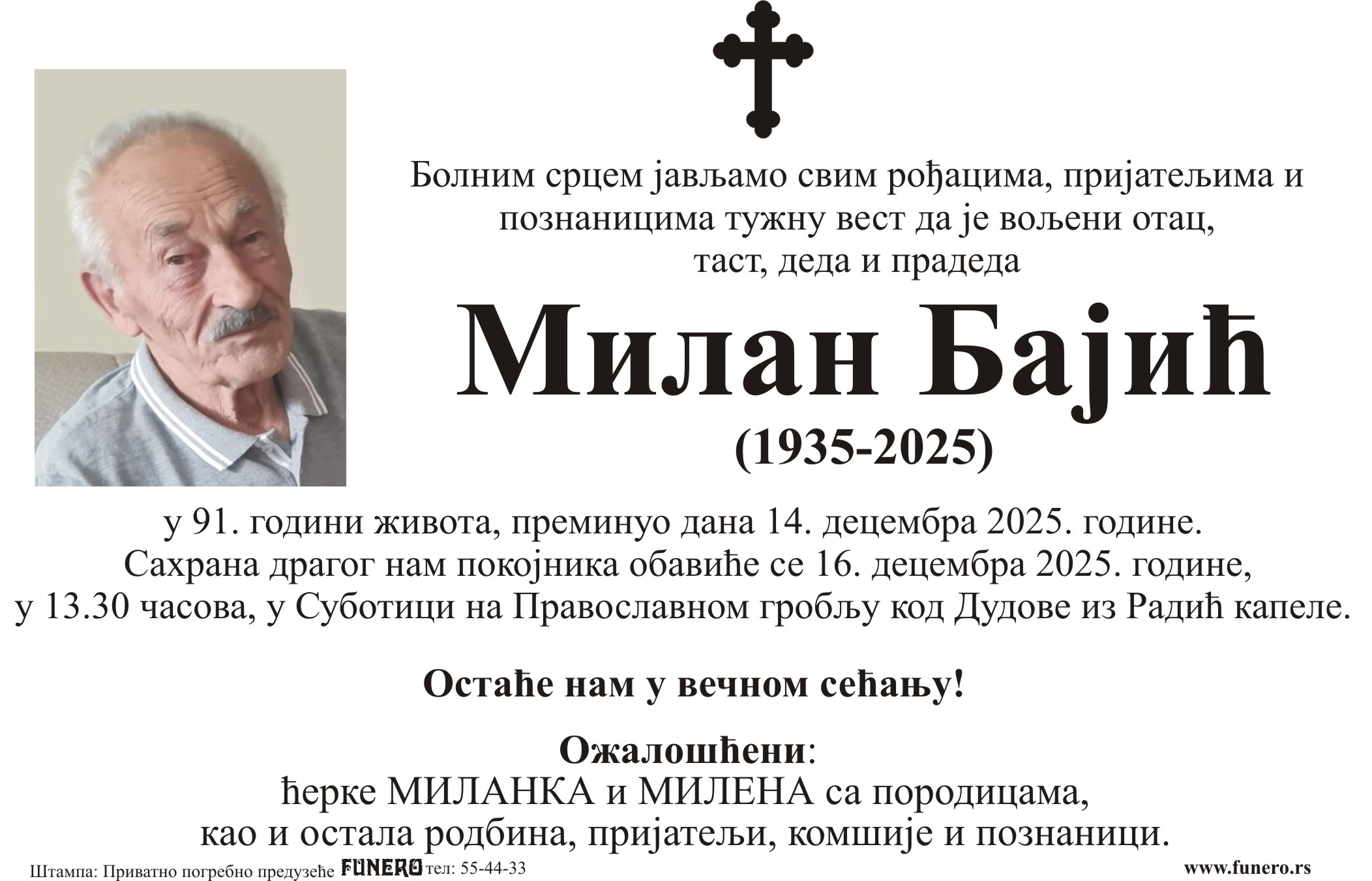 U 90. godini preminuo je Milan Bajić iz Đurđina, iz Vojvođanske ulice. Sahrana je 16. decembra u 13 časova i 30 minuta na Pravoslavnom groblju kod Dudove šume iz Radić kapele.
