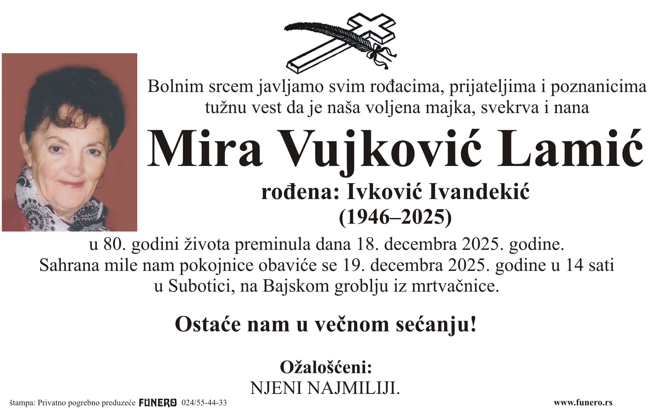 U 79. godini preminula je Mira Vujković Lamić iz Subotice, iz Mičurinove ulice. Sahrana je 19. decembra u 14sati na Bajskom groblju iz mrtvačnice.