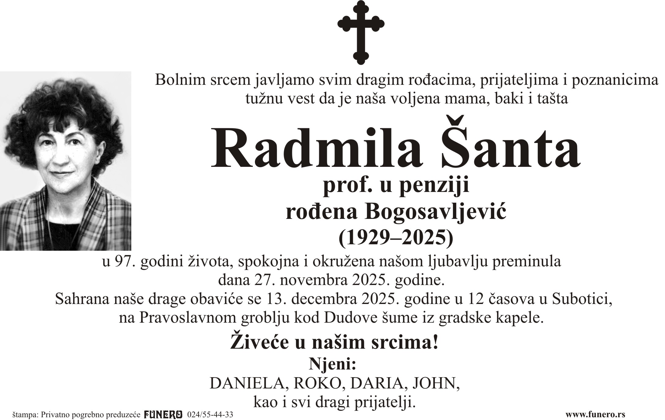 U 96. godini preminula je Radmila Šanta iz Subotice, sa Aleje maršala Tita. Polaganje urne je 13. decembra u 12 sati na groblju kod Dudove šume iz gradske kapele.