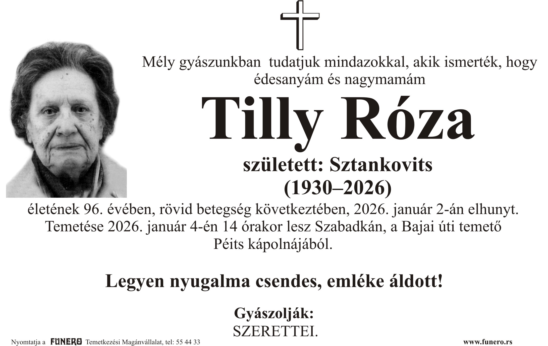 U 96. godini preminula je Roza Tili iz Subotice, iz Šenoine ulice. Sahrana je 4. februara u 14 sati na Bajskom groblju iz Peić kapele.