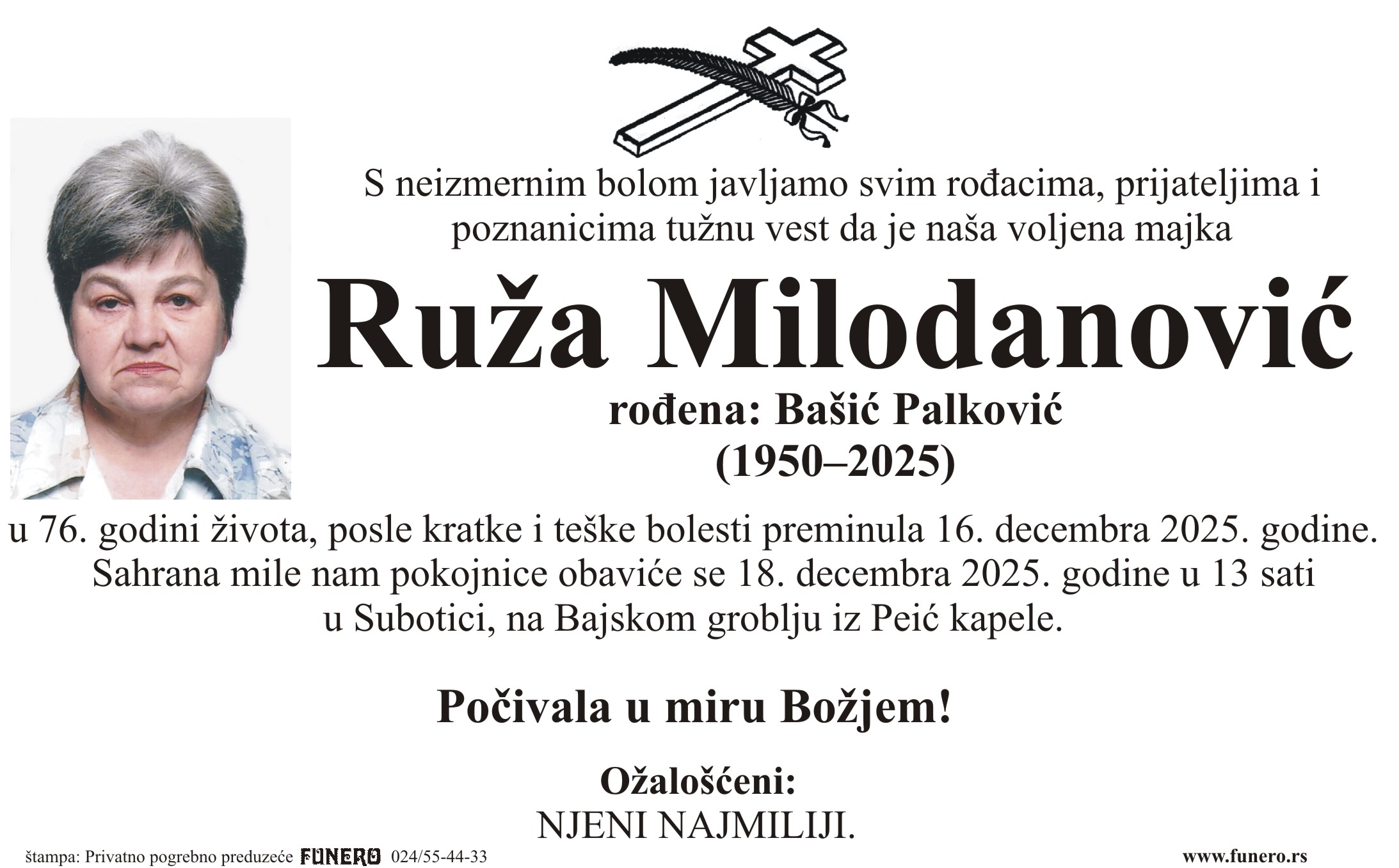 U 75. godini preminula je Ruža Milodanović iz Subotice, iz Kozjačke ulice. Sahrana je 18. decembra u 13 sati na Bajskom groblju iz Peić kapele.