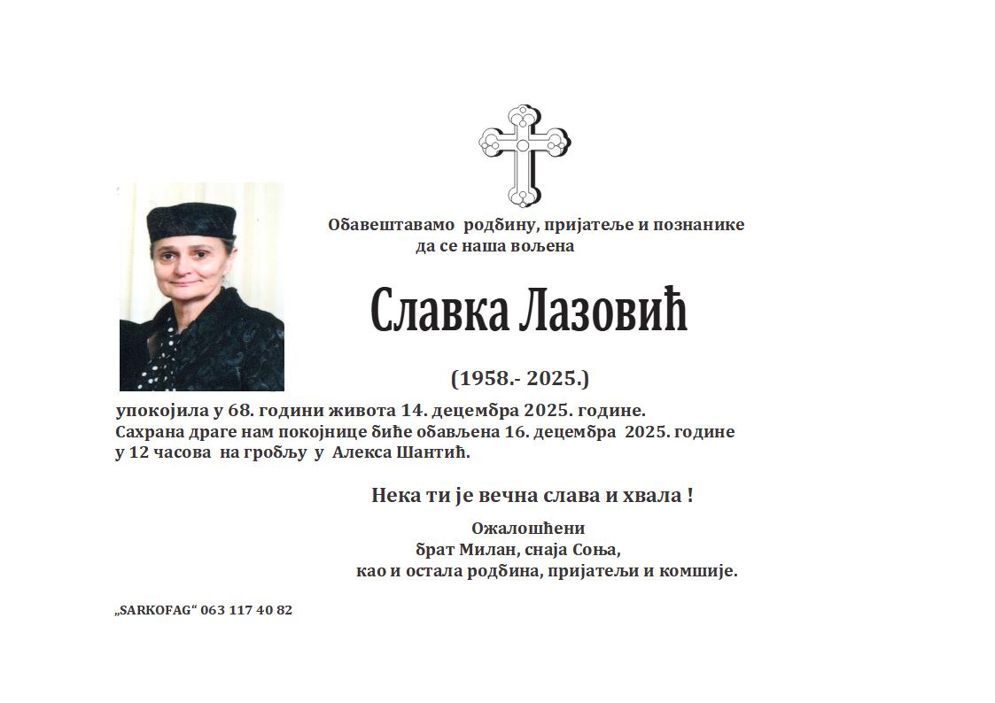 U 92. godini preminuo je Lidija Branisavljević iz Subotice, iz ulice Starine Novaka. Sahrana je 8. decembra u 15 časova na Pravoslavnom groblju u Aleksandrovu iz crkvene kapele.
