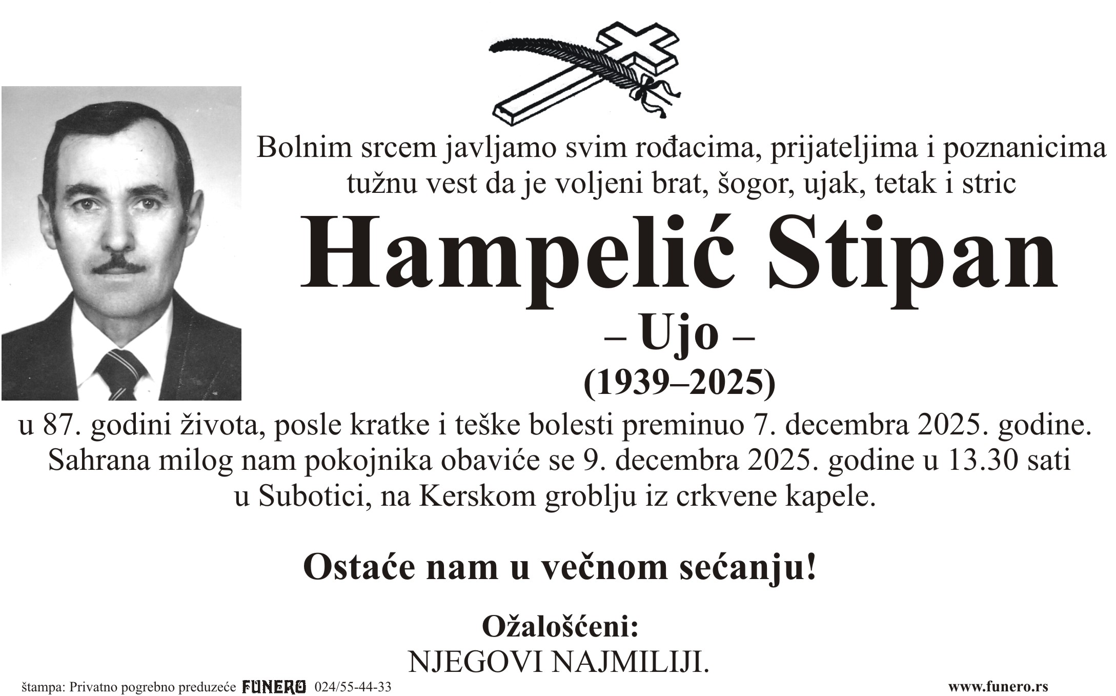 U 86. godini preminuo je Stipan Hampelić iz Subotice, iz Futoške ulice. Sahrana je 9. decembra u 13 sati i 30 minuta na Kerskom groblju iz crkvene kapele.