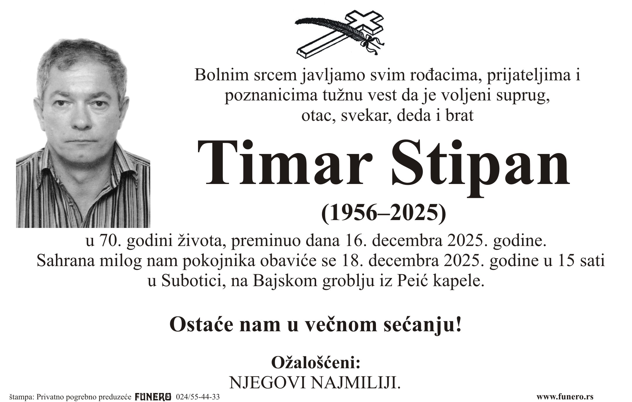 U 69. godini preminuo je Stipan Timar iz Subotice, iz Baranjske ulice. Sahrana je 18. decembra u 15 sati na Bajskom groblju iz Peić kapele.
