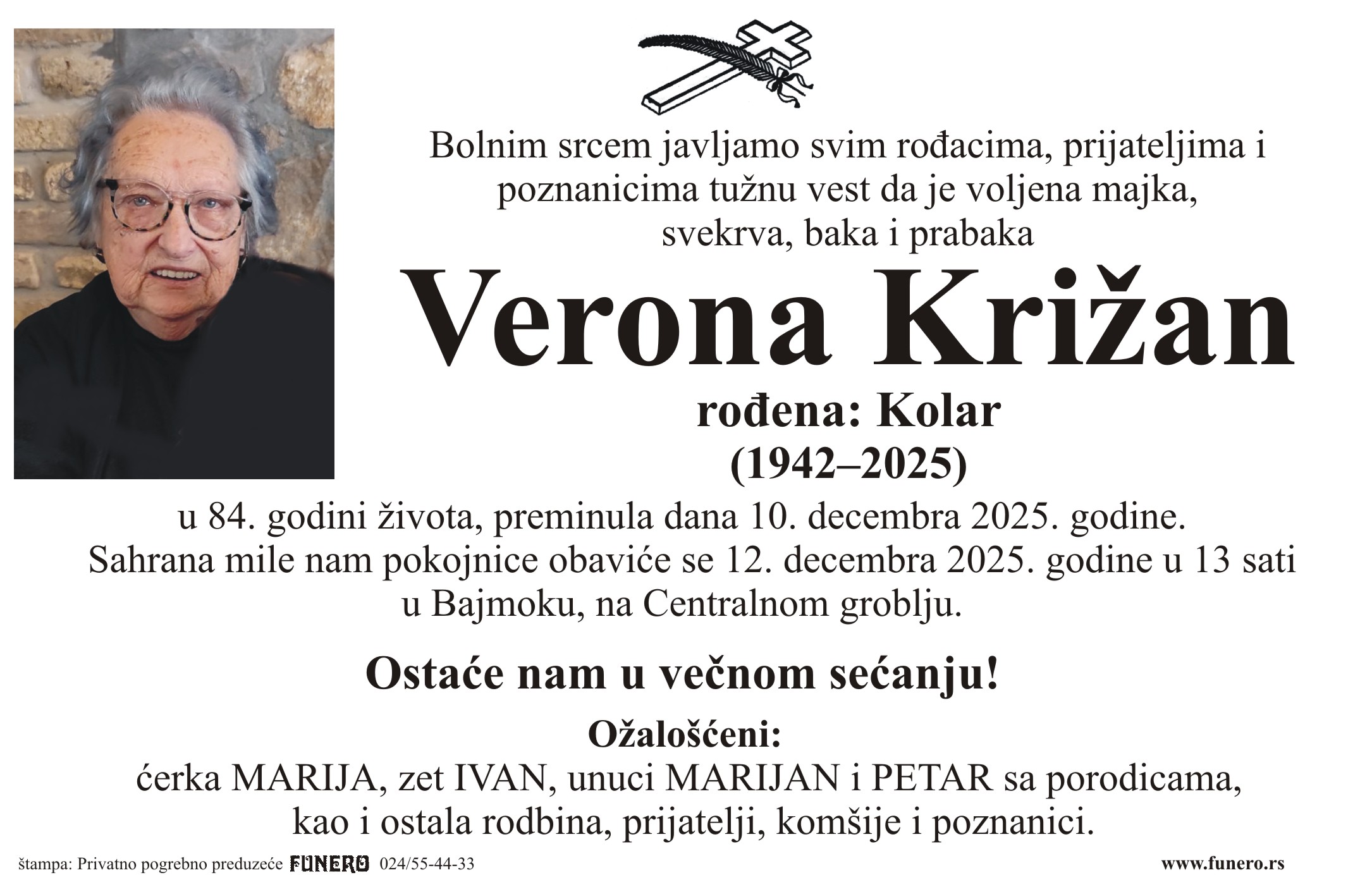 U 83. godini preminula je Verona Križan iz Bajmoka, iz ulice Moše Pijade. Sahrana je 12. decembra u 13 sati na Centralnom groblju u Bajmoku.