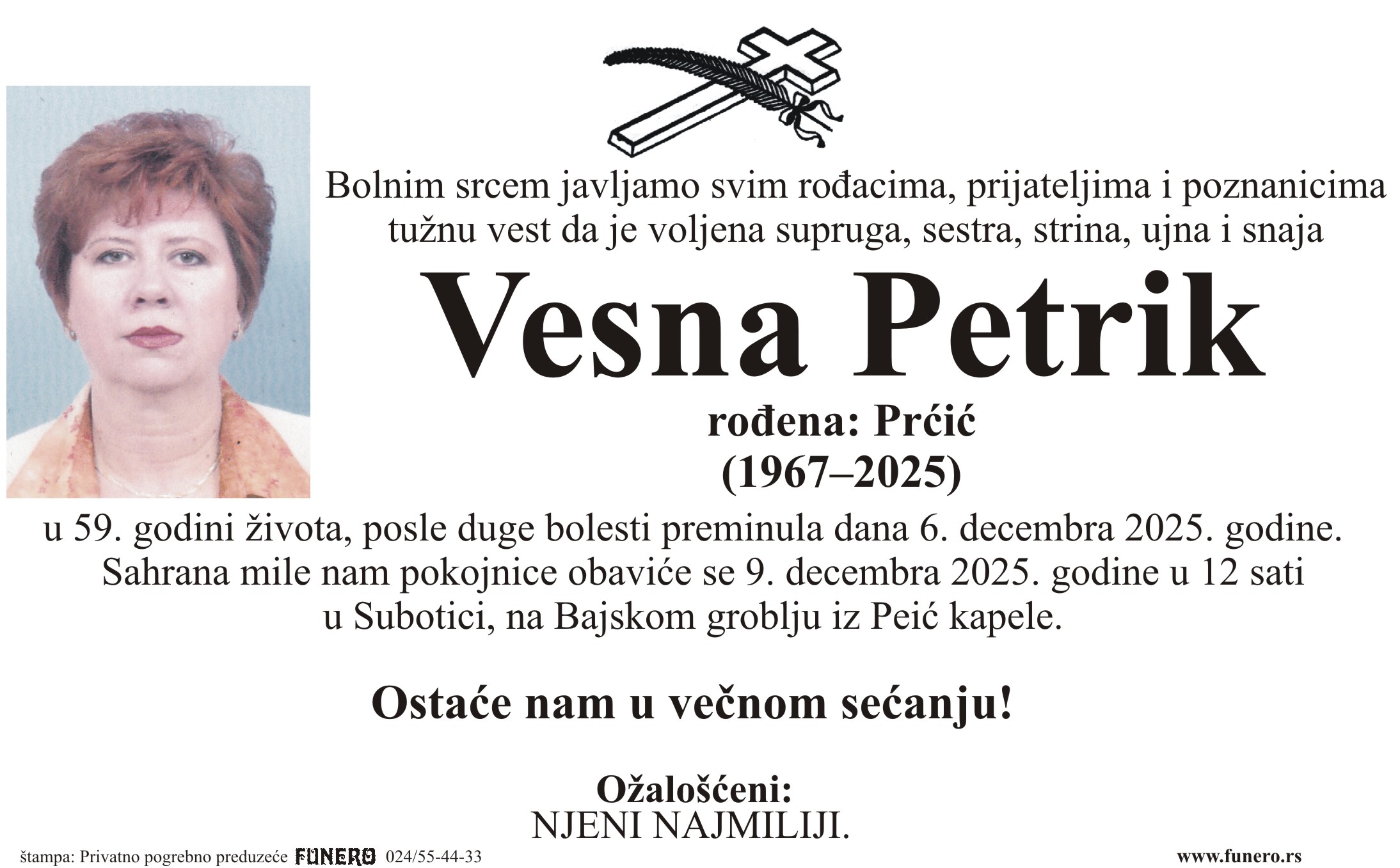 U 58. godini preminula je Vesna Petrik iz Subotice, iz ulice Isidore Sekulić. Sahrana je 9. decembra u 12 sati na Bajskom groblju iz Peić kapele.