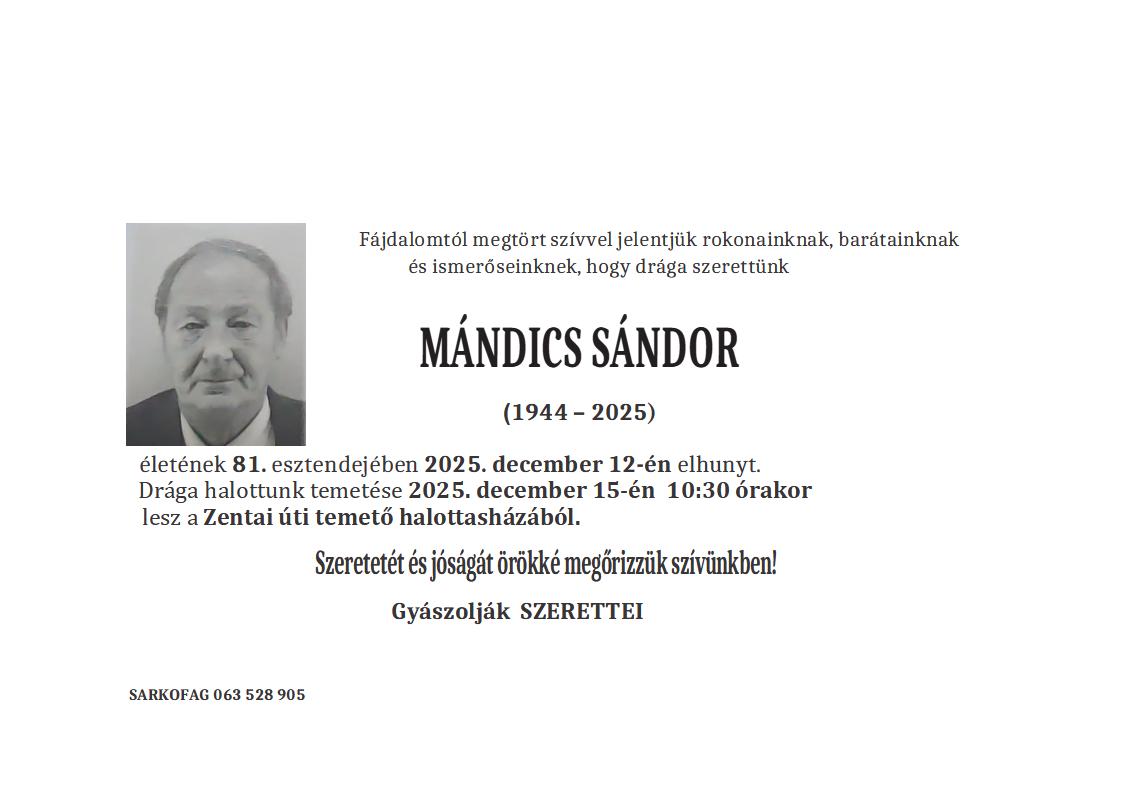 U 69. godini preminuo je Mirko Sarić iz Subotice, iz ulice Lajoša Joa. Sahrana je 5. decembra u 13 sati na groblju u Donjem Tavankutu.
