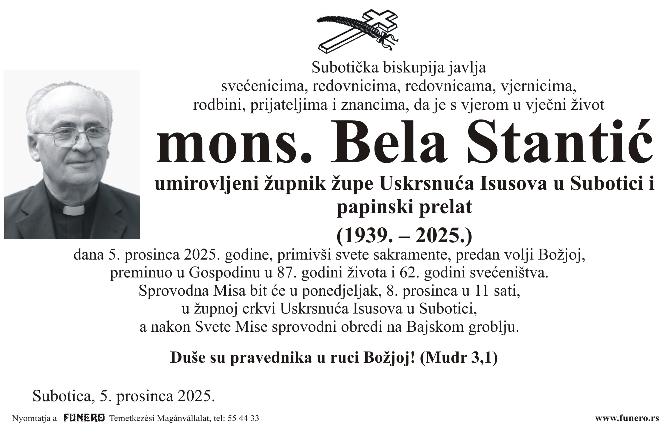U 86. godini preminuo je mons. Bela Stantić iz Subotice, iz Harambašićeve ulice. Sprovodna misa je 8. decembra u 11 sati u crkvi Isusovo Uskrsnuće nakon čega sahrana je u crkvenom delu Bajskog groblja.