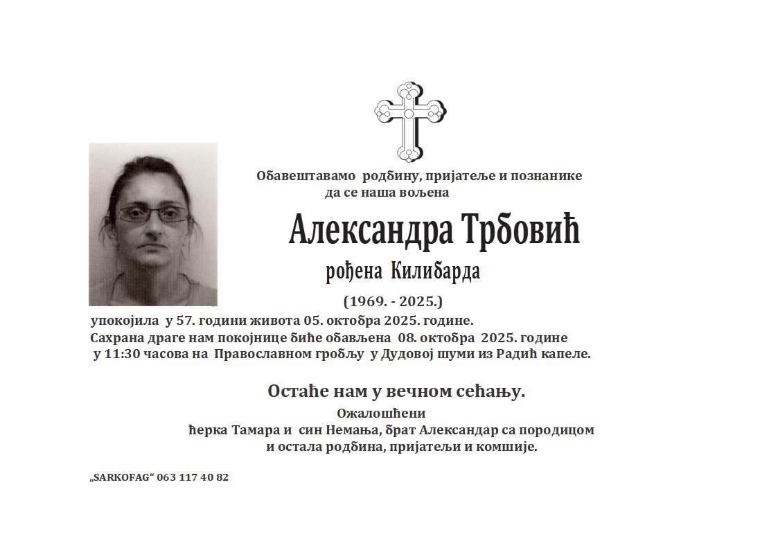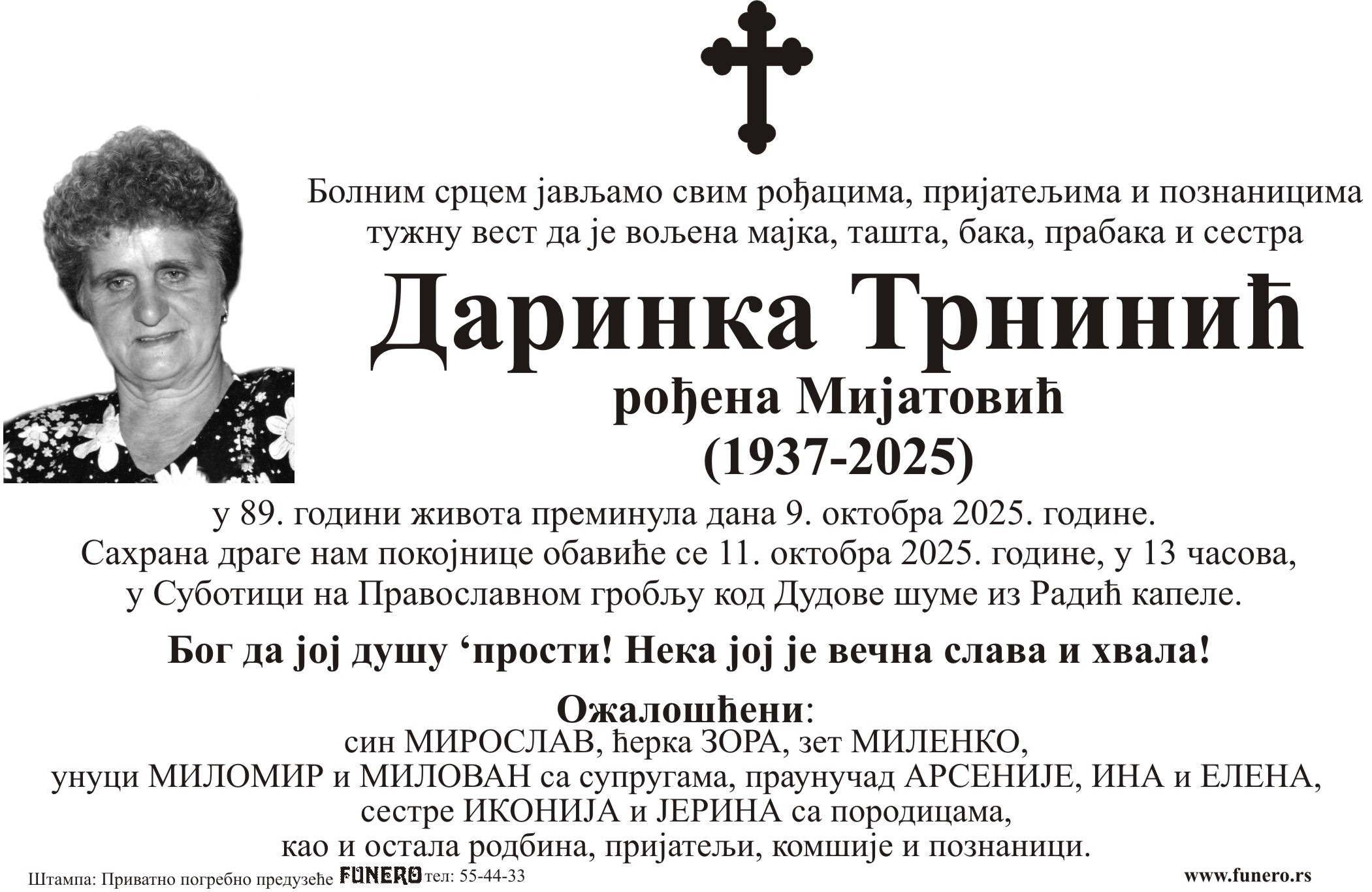 U 88. godini preminula je Darinka Trninić iz Oroma, iz ulice Mikloša Radnotija. Sahrana je 11. oktobra u 13 časova na Pravoslavnom groblju kod Dudove šume iz Radić kapele.