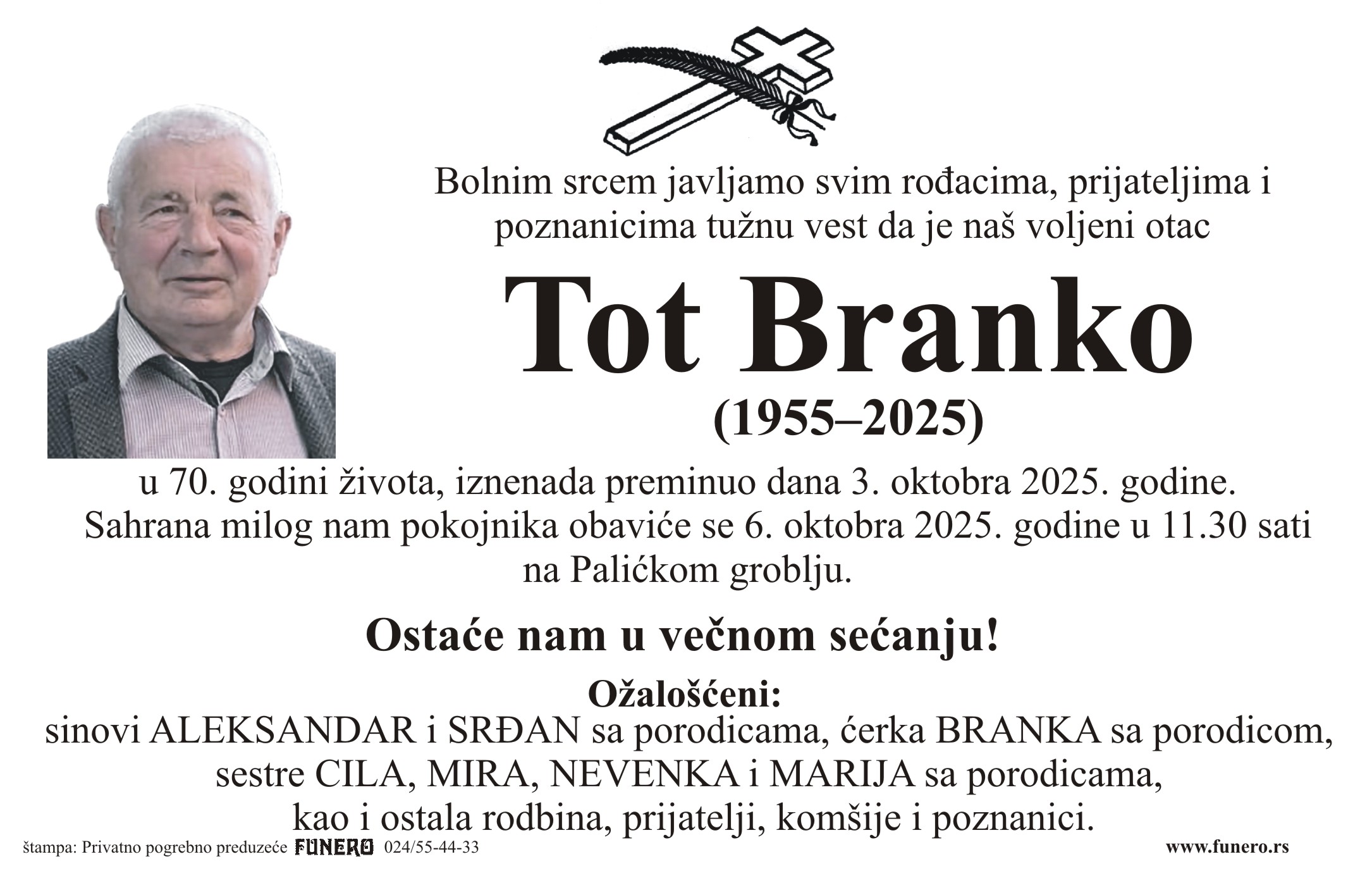 U 70. godini preminuo je Branko Tot sa Palića, iz Dubrovačke ulice. Sahrana je 6. oktobra u 11 sati i 30 minuta na Palićkom groblju.