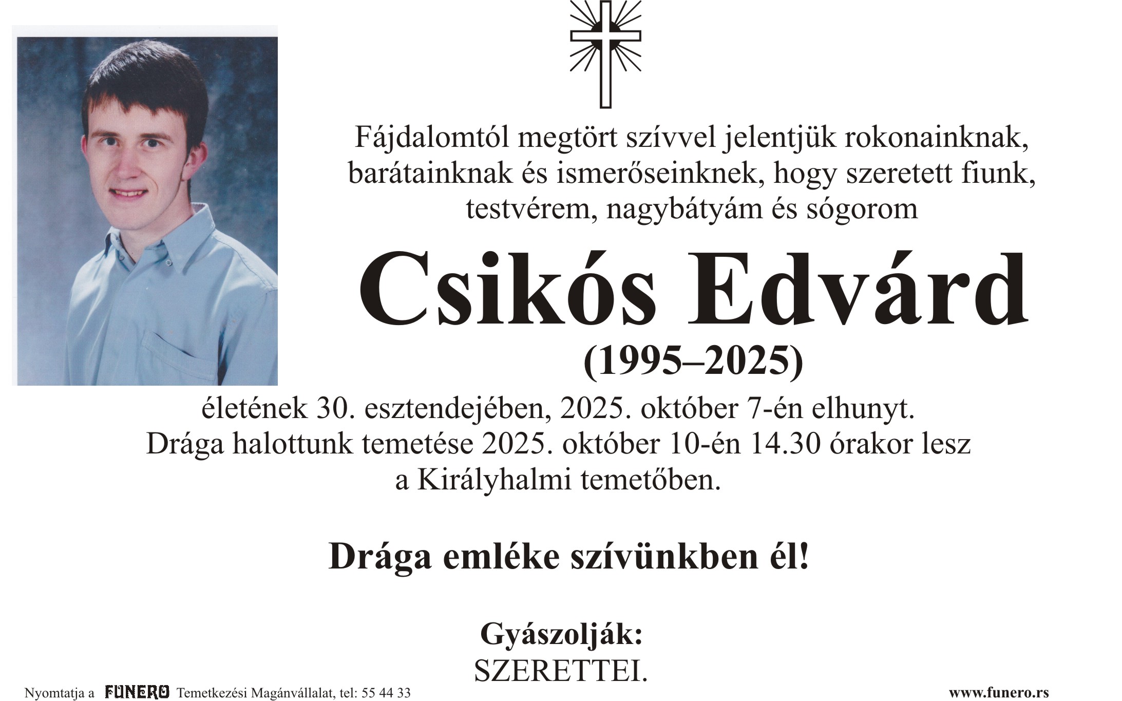 U 30. godini preminuo je Edvard Čikoš iz Hajdukova, iz ulice Pere Popović Age. Sahrana je 10. oktobra u 14 sati i 30 minuta na groblju u Bačkim Vinogradima.