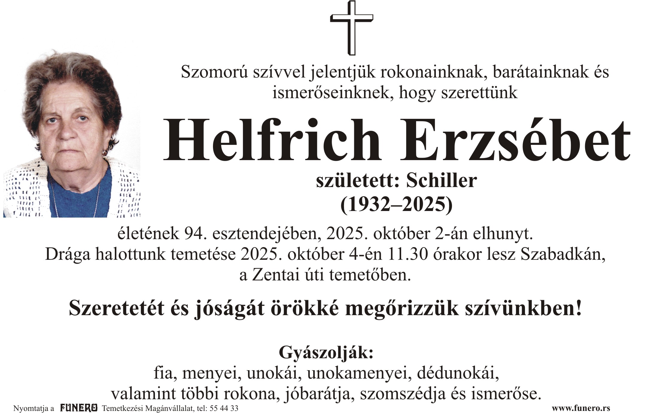 U 93. godini preminula je Eržebet Helfrih iz Subotice, iz ulice Braće Radića. Sahrana je 4. oktobra u 11 sati i 30 minuta na Senćanskom groblju.