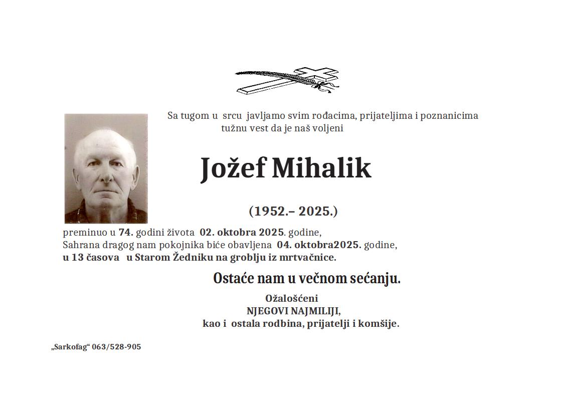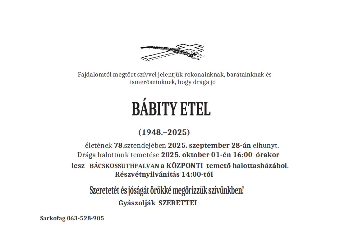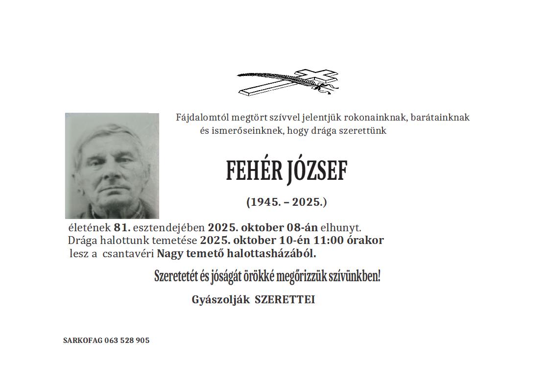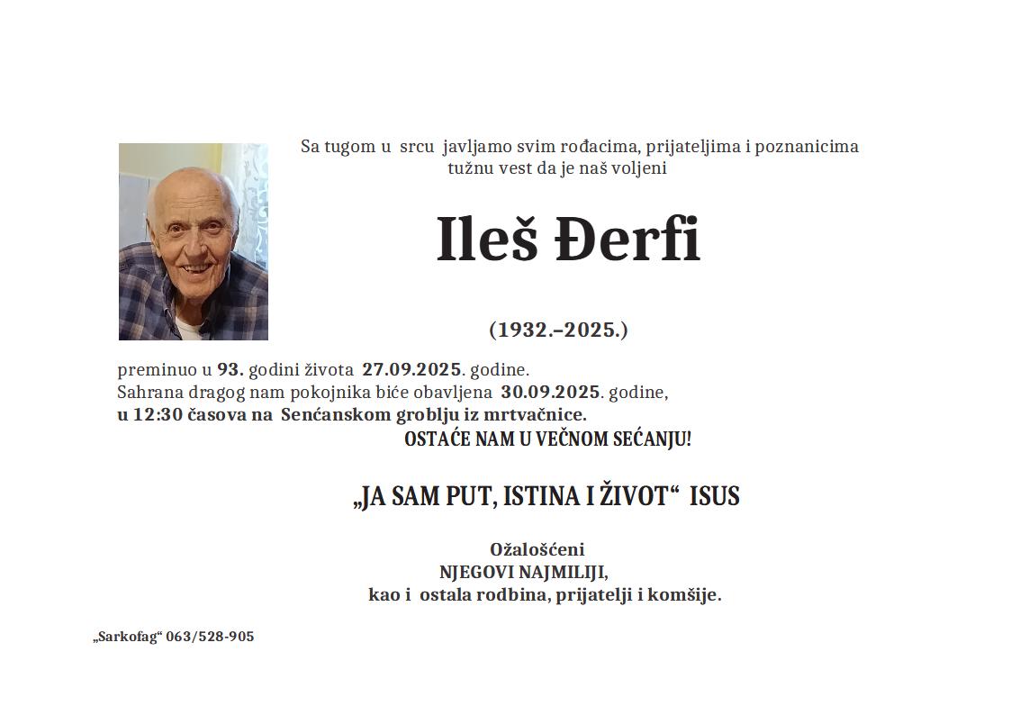 U 76. godini preminuo je Jožef Udvari iz Subotice, iz ulica Kajsija. Sahrana je 8. oktobra u 16 sati na Bajskom groblju iz Peić kapele.