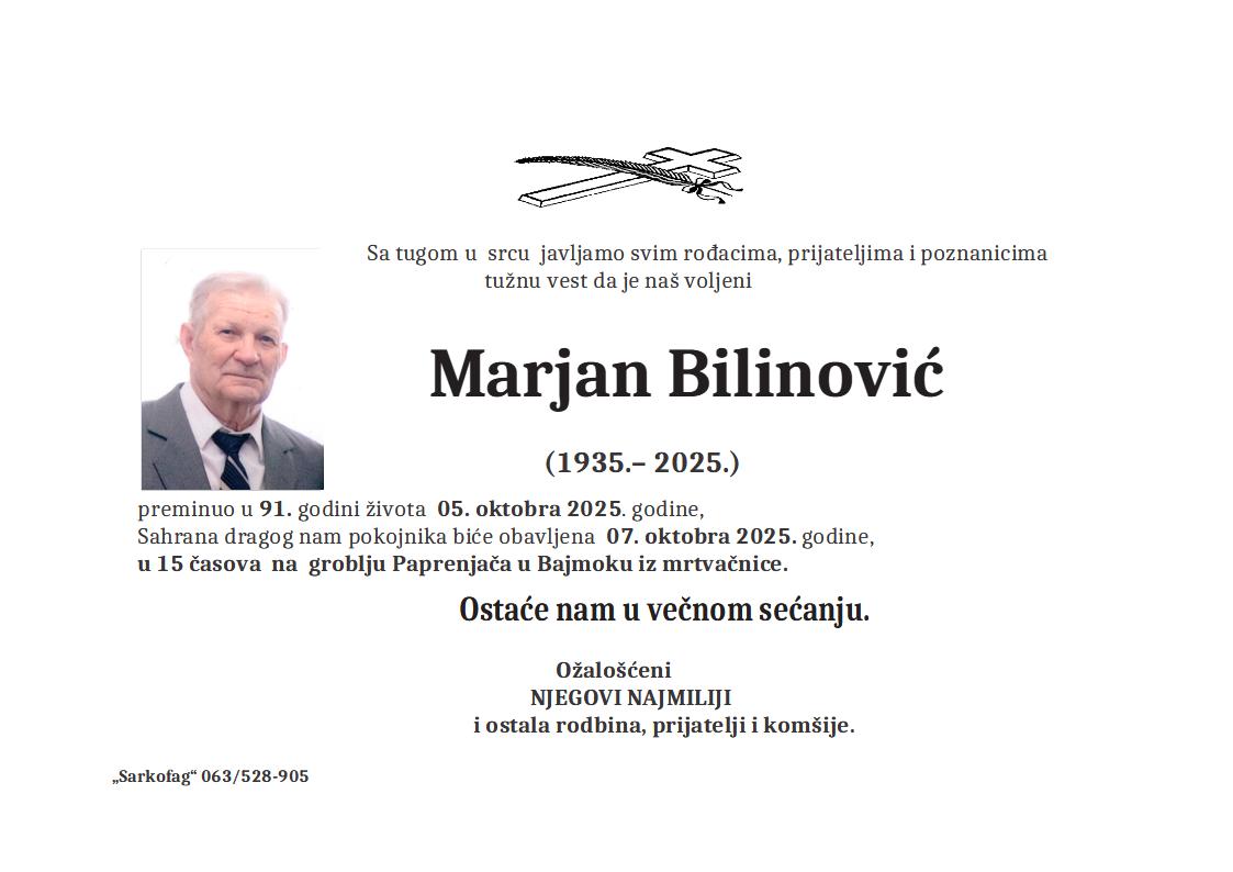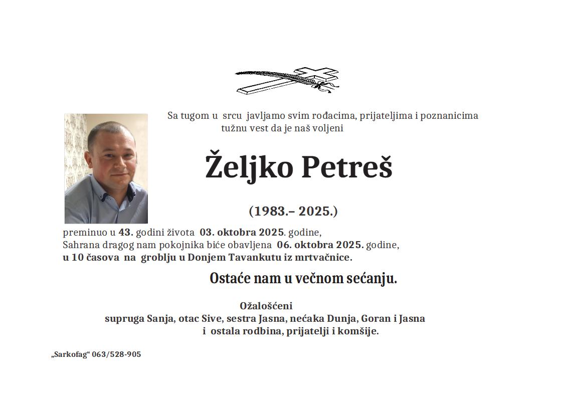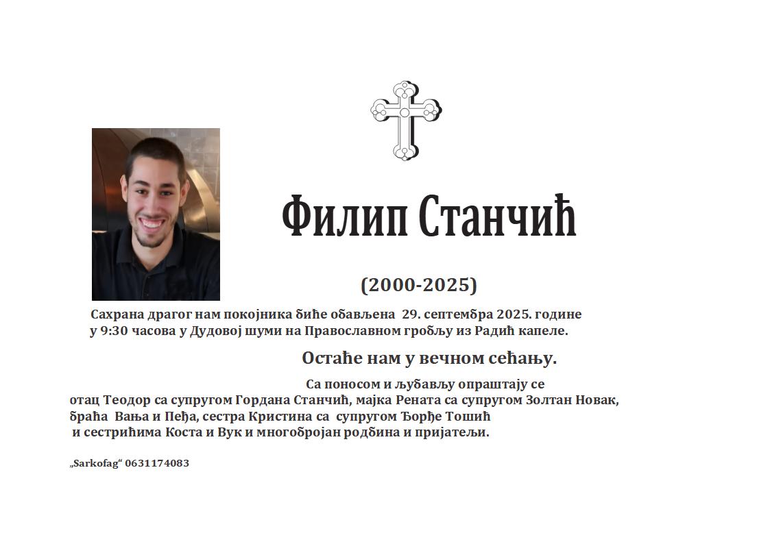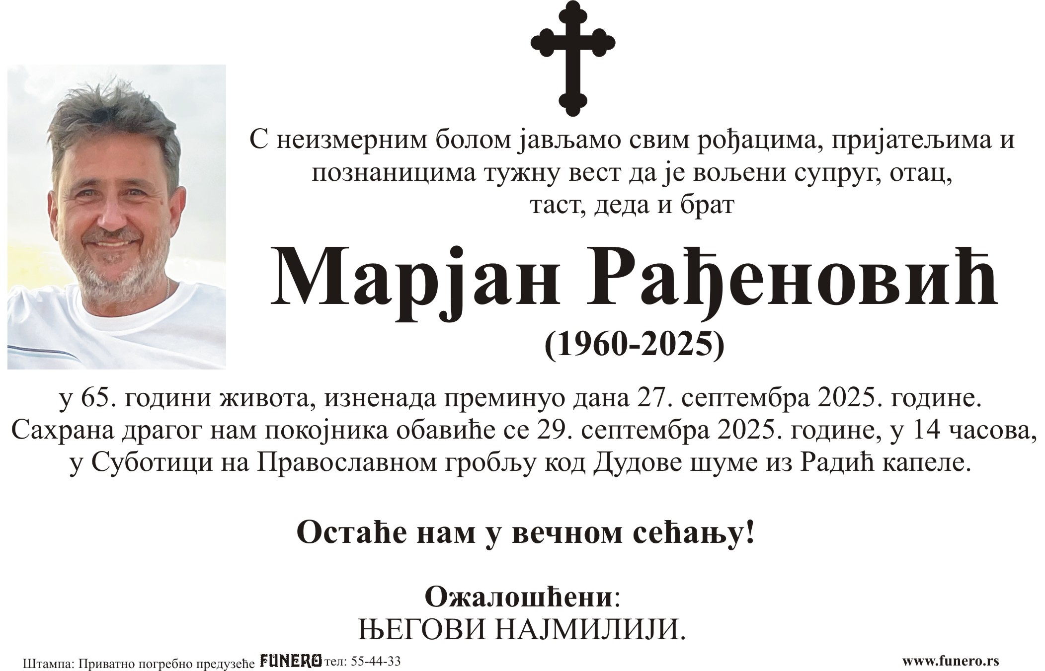 U 65. godini preminuo je Marjan Rađenović iz Subotice, iz Praške ulice. Sahrana je 29. septembra u 14 časova na Pravoslavnom groblju kod Dudove šume iz Radić kapele.