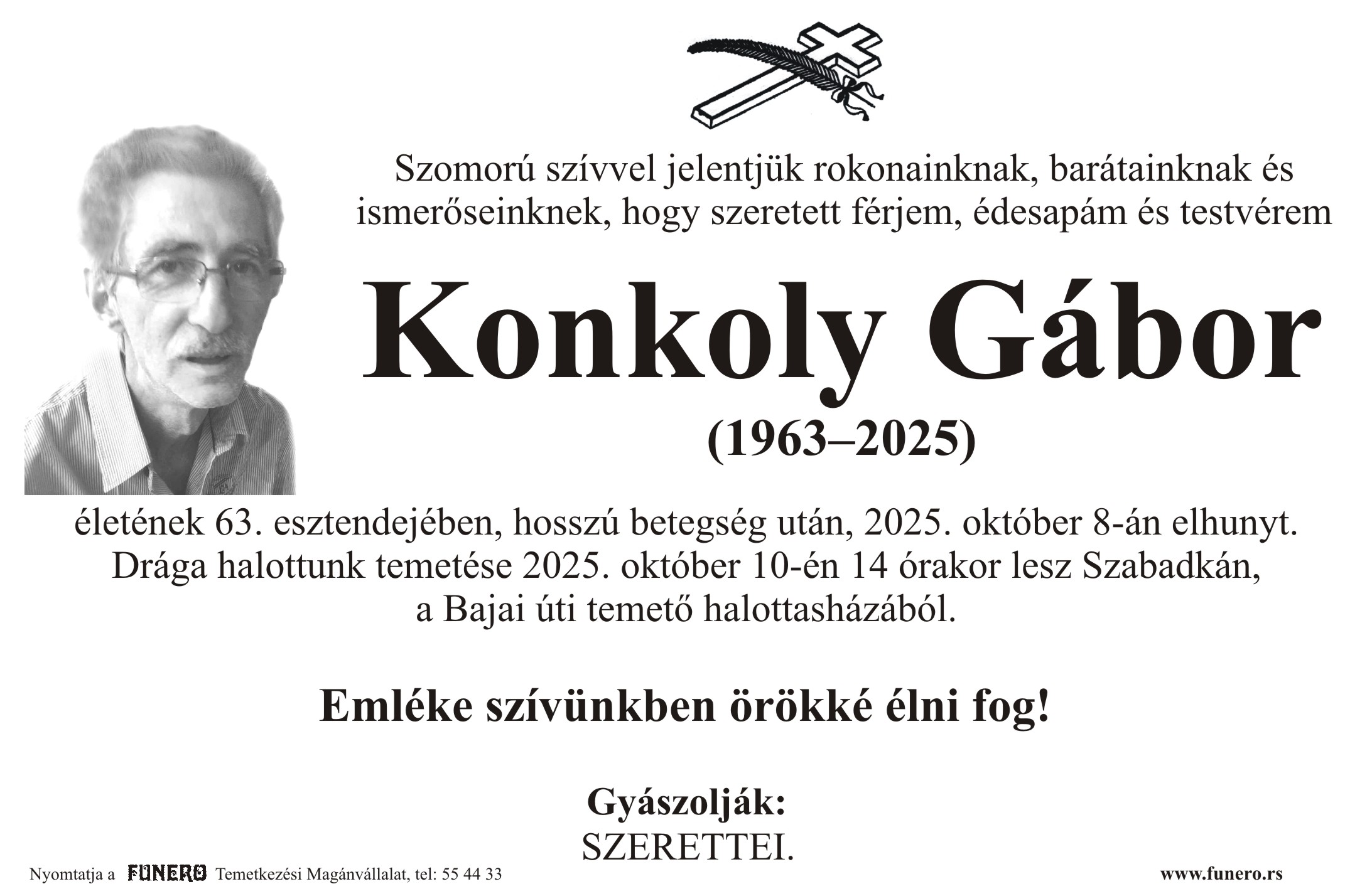 U 62. godini preminuo je Gabor Konkolj iz Subotice, iz 9. Nove ulice. Sahrana je 10. oktobra u 14 sati na Bajskom groblju iz mrtvačnice.