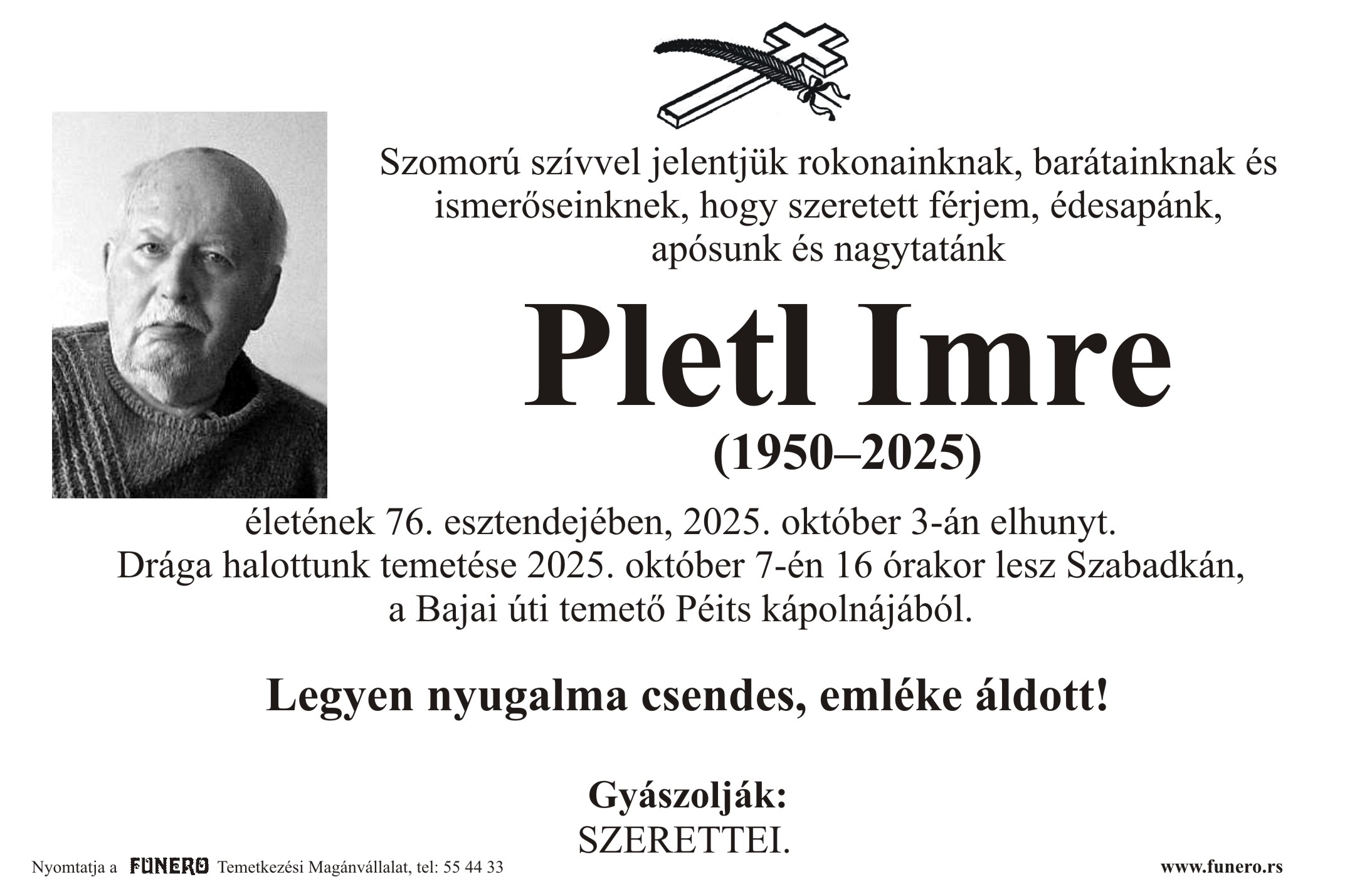 U 75. godini preminuo je Imre Pletl iz Subotice, iz ulice Stevana Filipovića. Sahrana je 7. oktobra u 16 sati na Bajskom groblju iz Peić kapele.