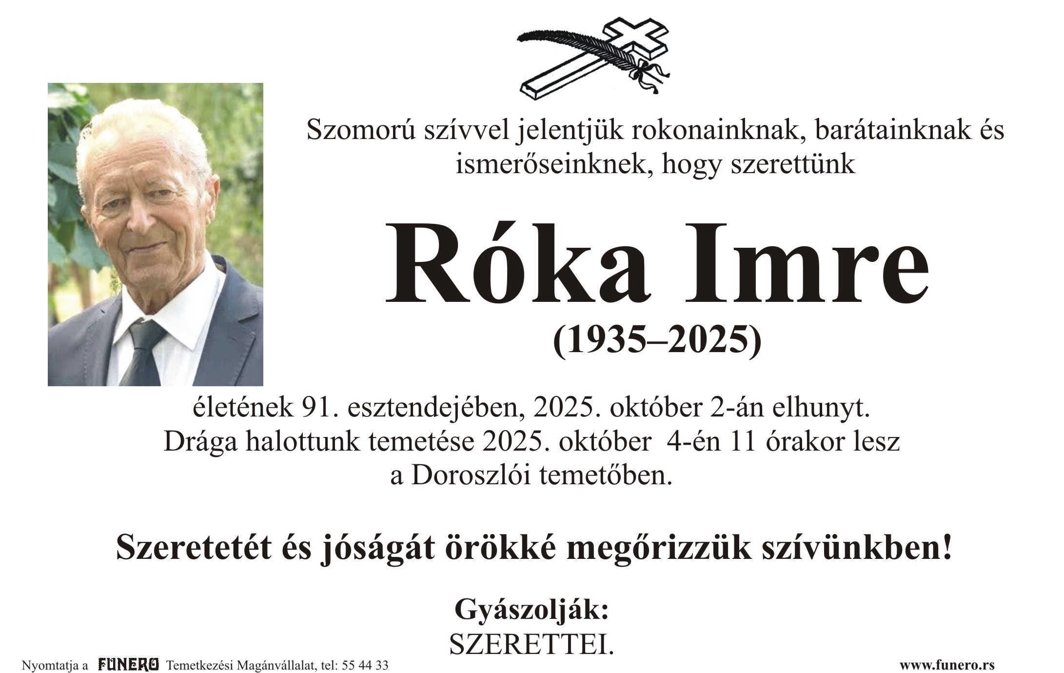 U 90. godini preminuo je Imre Roka iz Doroslova. Sahrana je 4. oktobra u 11 sati na groblju u Doroslovu.