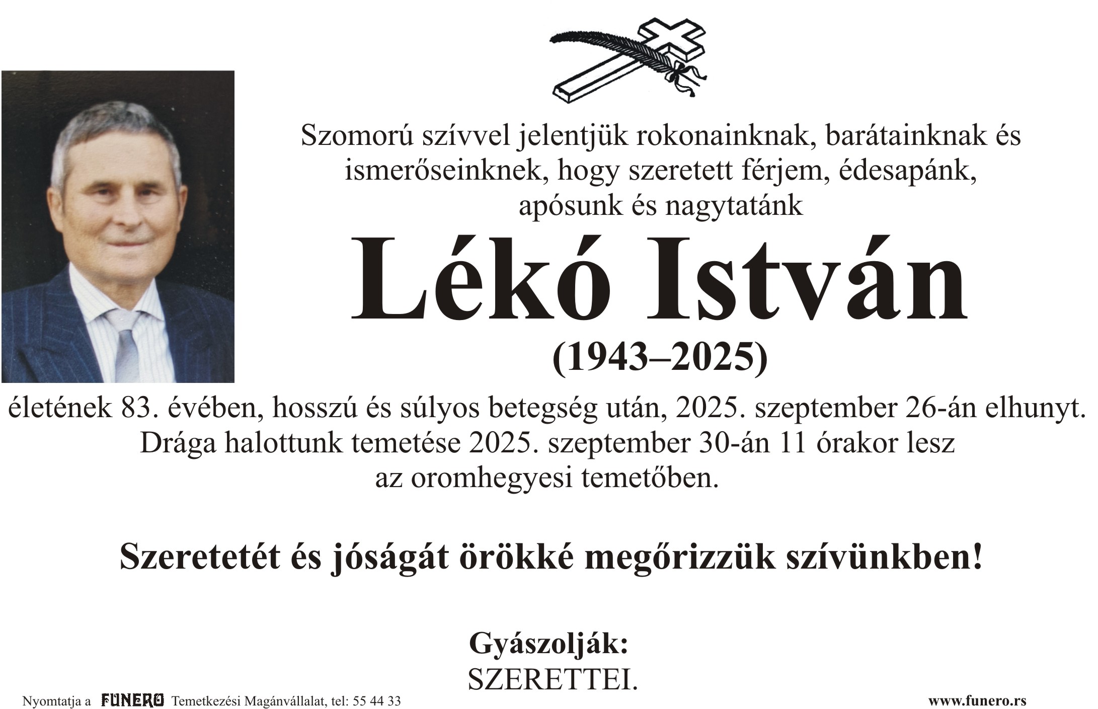 U 82. godini preminuo je Ištvan Leko iz Subotice, iz Samoborske ulice. Sahrana je 30. septembra u 11 sati na groblju u Trešnjevcu.