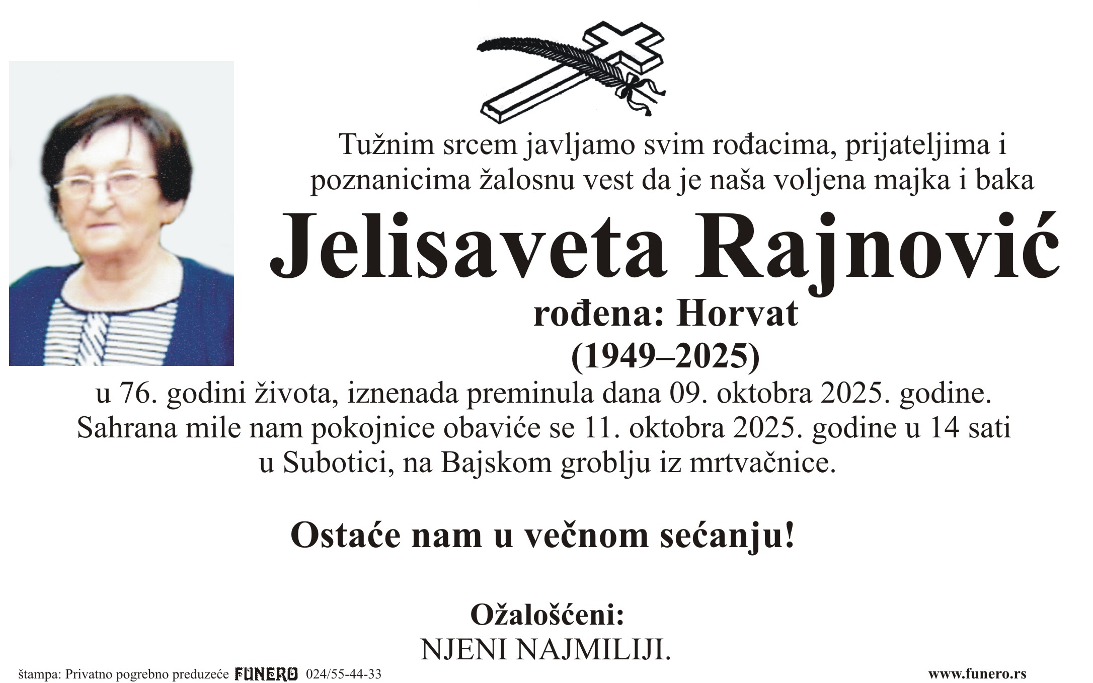 U 76. godini preminula je Jelisaveta Rajnović iz Subotice, iz ulice Endrea Adija. Sahrana je 11. oktobra u 14 sati na Bajskom groblju iz mrtvačnice.