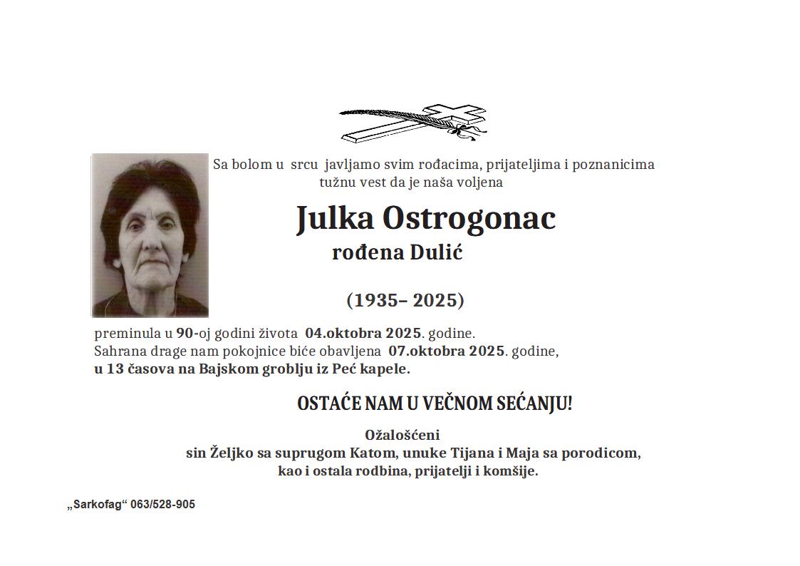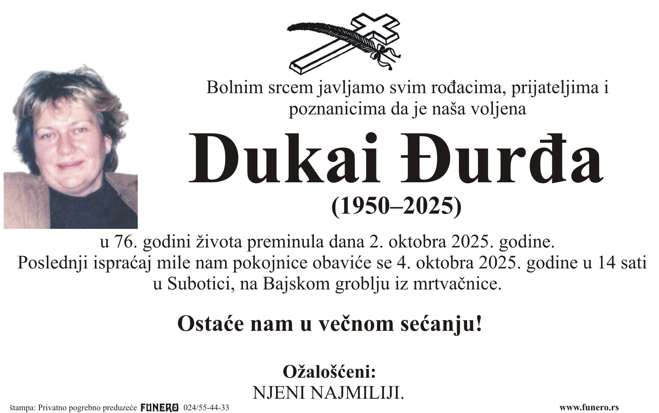 U 75. godini preminula je Đurđa Dukai iz Subotice, iz ulice Arsenija Čarnojevića. Sahrana je 4. oktobra u 14 sati na Bajskom groblju iz mrtvačnice.