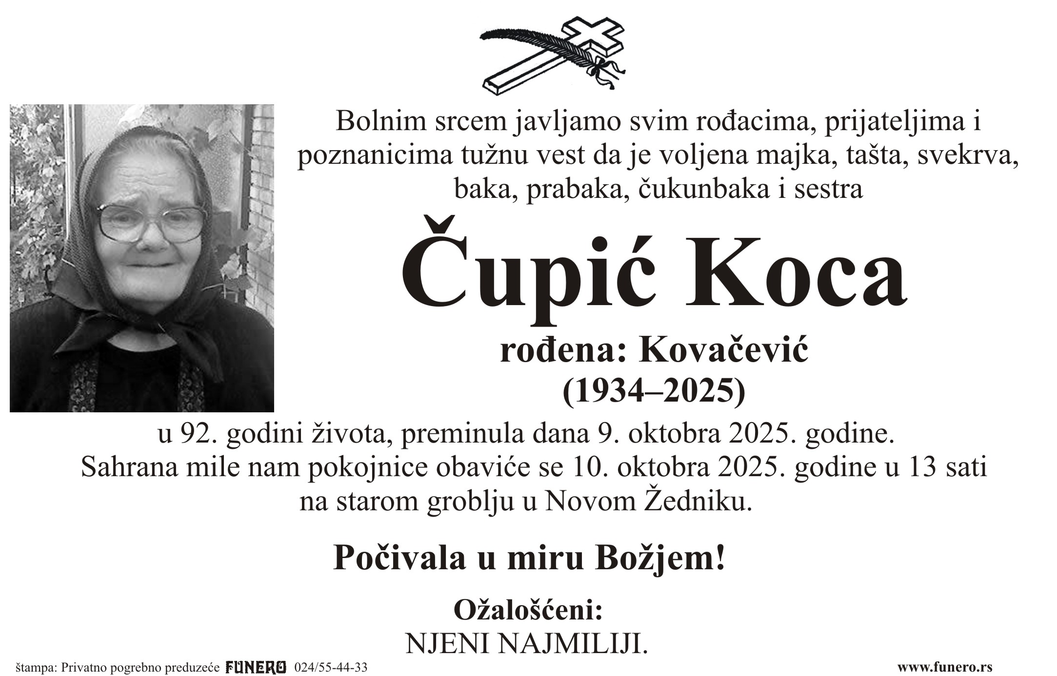U 91. godini preminula je Koca Čupić iz Novog Žednika, iz Kninske ulice. Sahrana je 10. oktobra u 13 sati na groblju u Novom Žedniku.