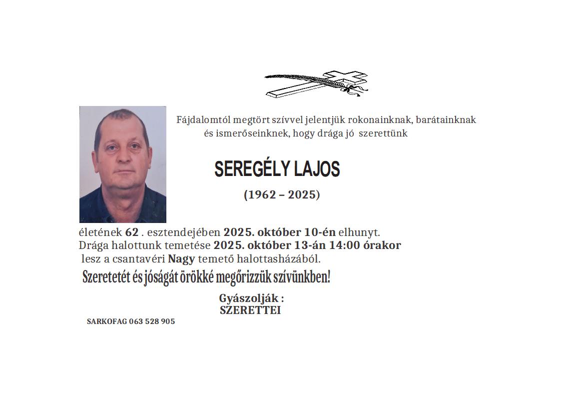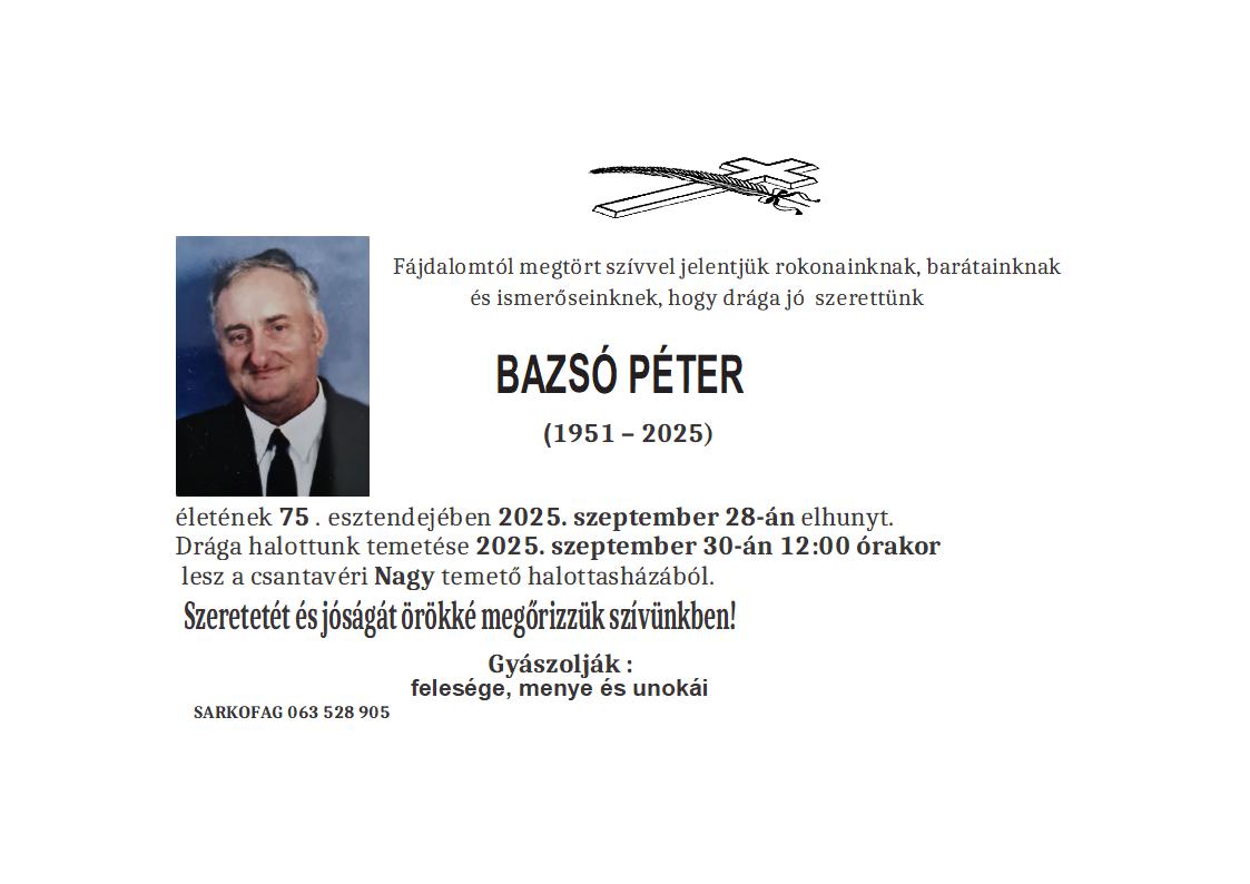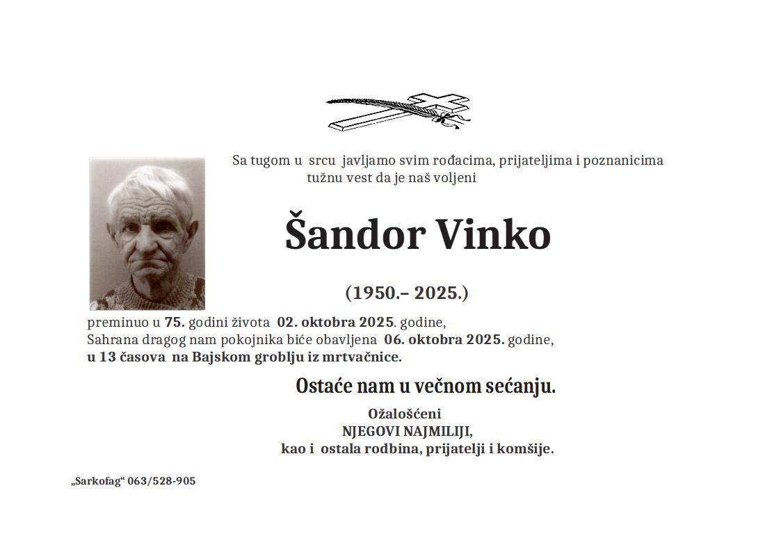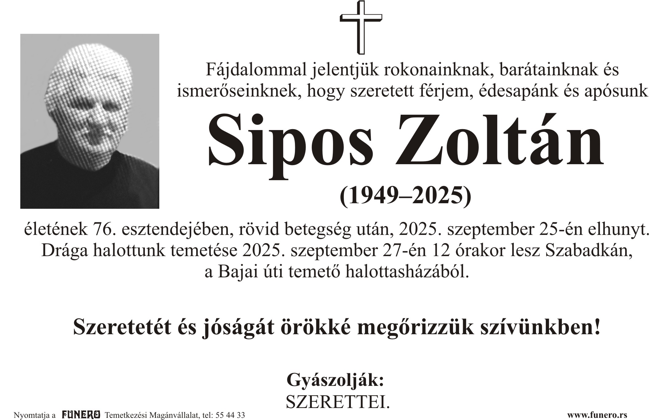 U 76. godini preminuo je Zoltan Šipoš iz Subotice, iz ulice Edvina Zdovca. Sahrana je 27. septembra u 12 sati na Bajskom groblju iz mrtvačnice.