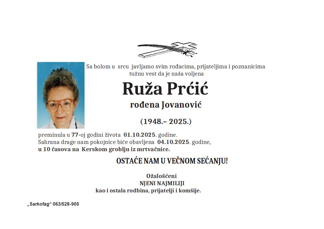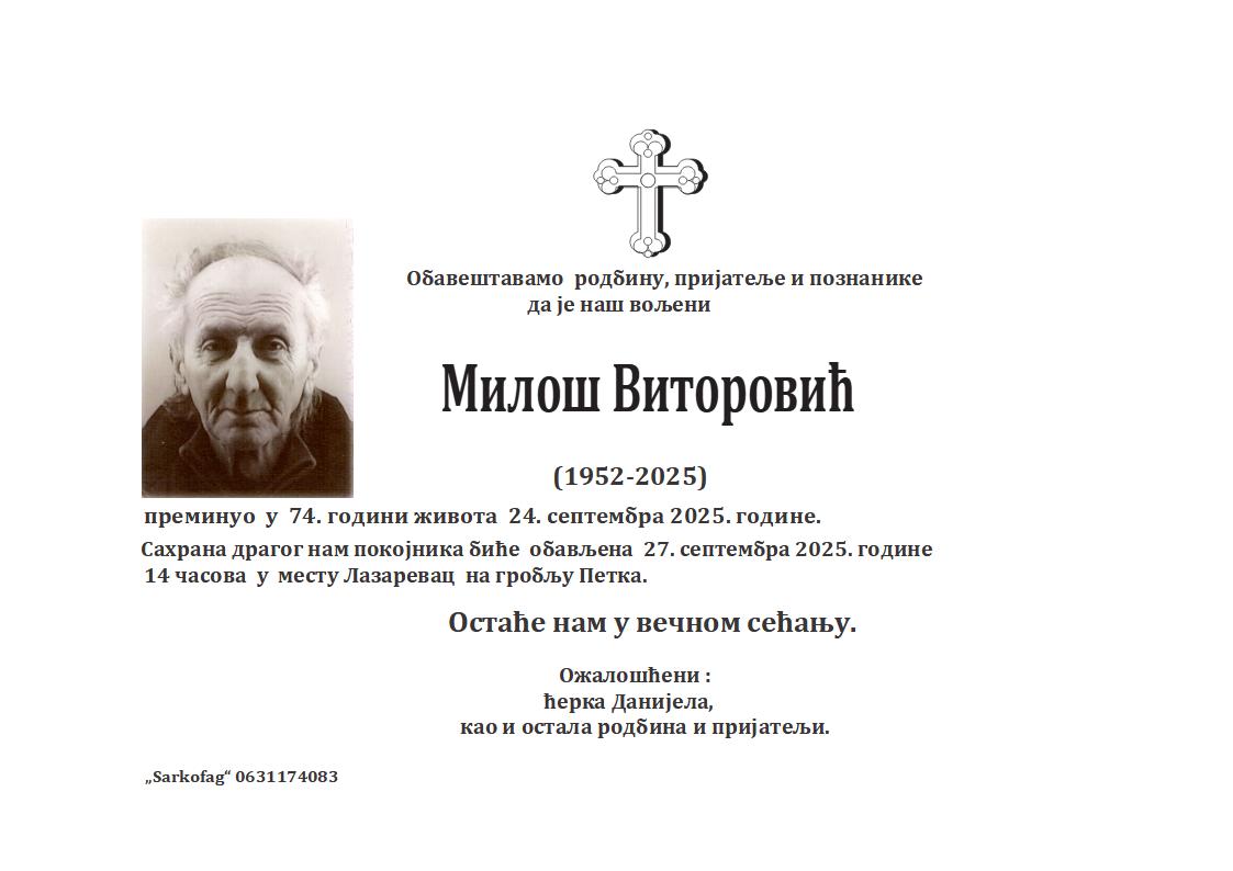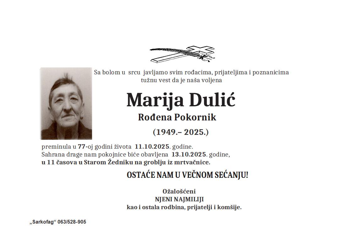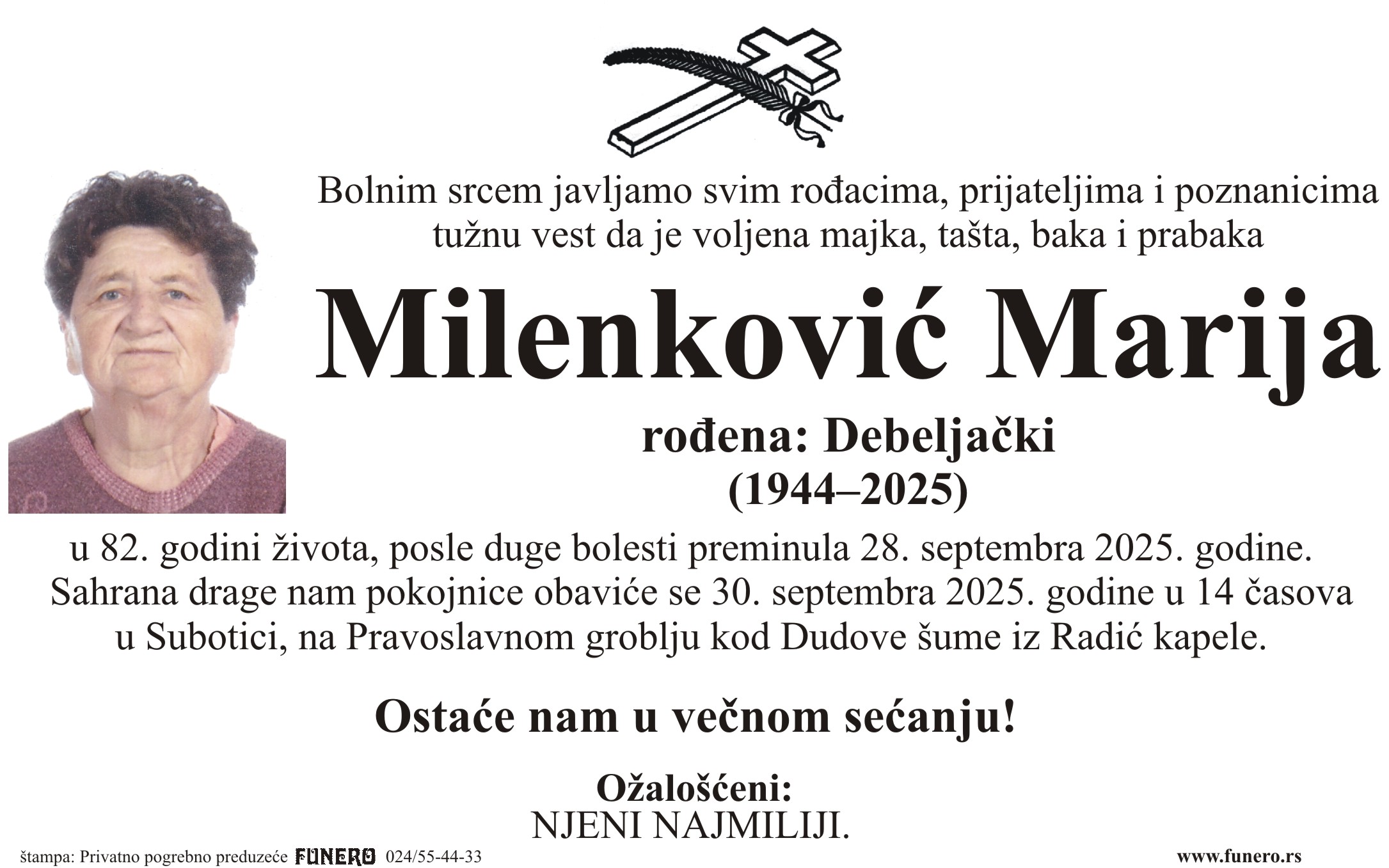 U 81. godini preminula je Marija Milenković iz Subotice, iz Nišavske ulice. Sahrana je 30. septembra u 14 časova na Pravoslavnom groblju kod Dudove šume iz Radić kapele.