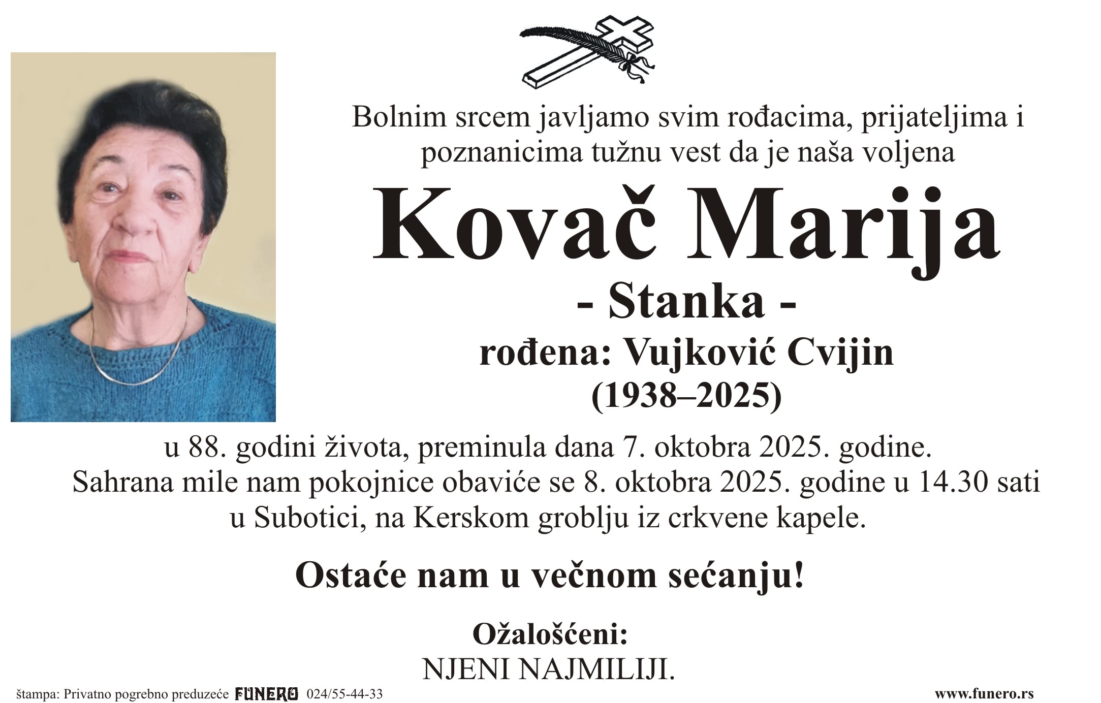 U 87. godini preminula je Marija Kovač iz Subotice, sa Aleje maršala Tita. Sahrana je 8. oktobra u 14 sati i 30 minuta na Kerskom groblju iz crkvene kapele.