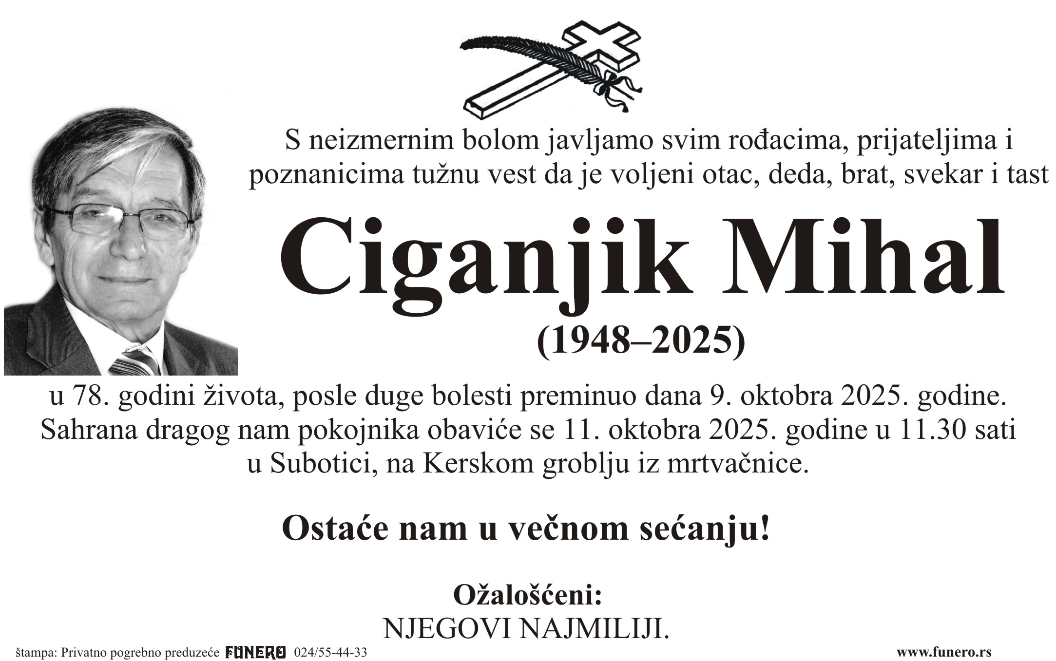 U 77. godini preminuo je Mihalj Ciganjik iz Subotice, sa Beogradskog puta. Sahrana je 11. oktobra u 11 sati i 30 minuta na Kerskom groblju iz mrtvačnice.
