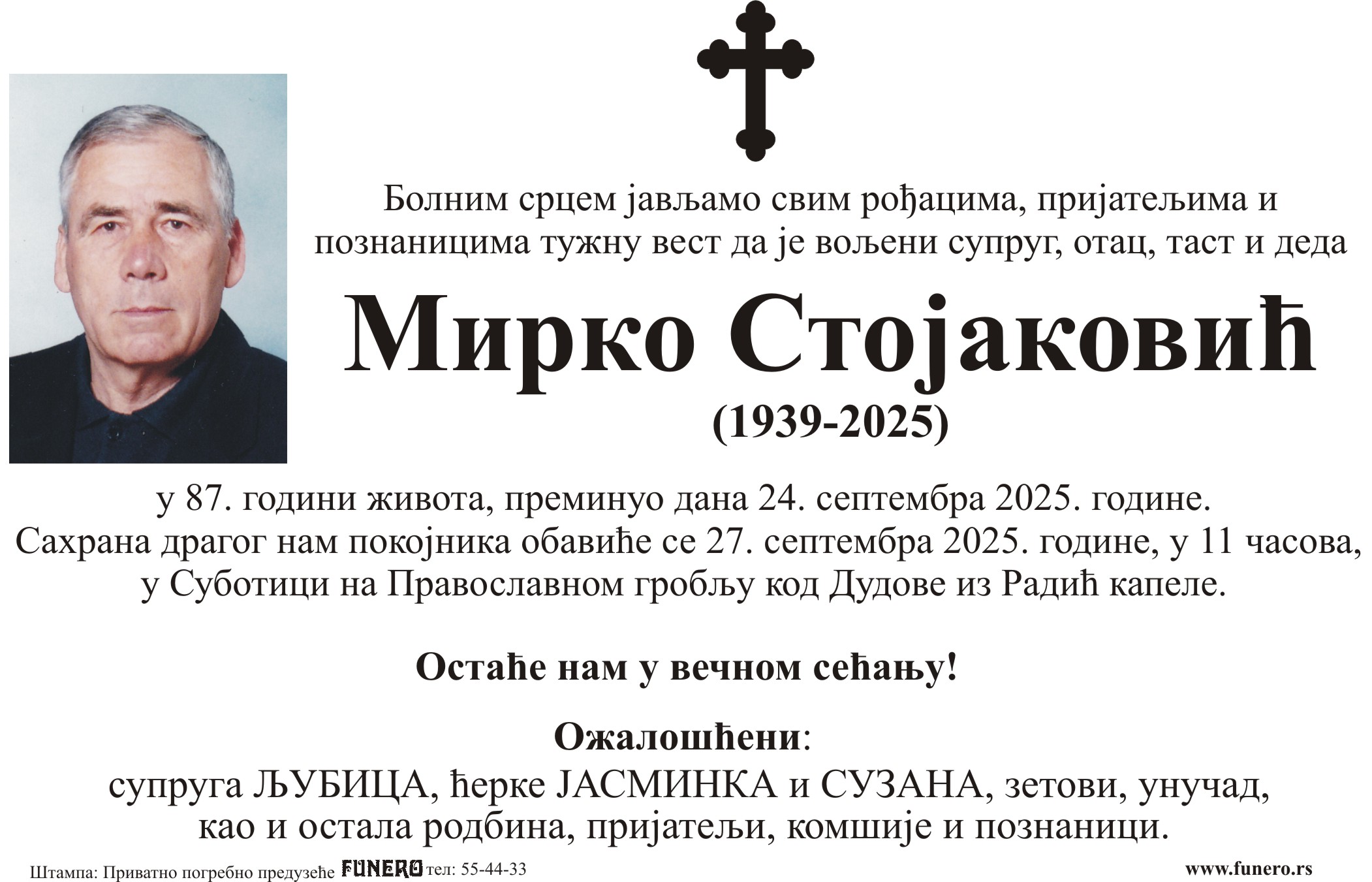 U 86. godini preminuo je Mirko Stojaković iz Subotice, sa Trga Cara Jovana Nenada. Sahrana je 27. septembra u 11 časova na Pravoslavnom groblju kod Dudove šume iz Radić kapele.