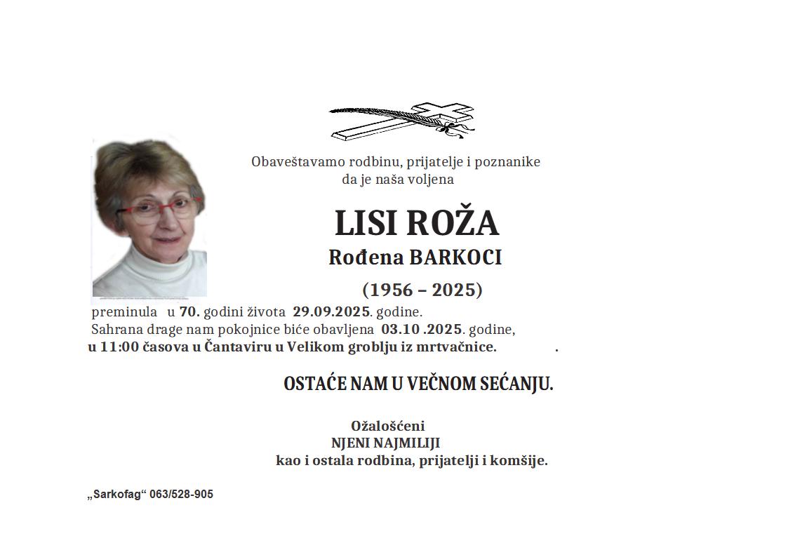 U 71. godini preminula je Marika Balog iz Subotice, iz ulice Tome Rudića Brace. Sahrana je 7. oktobra u 14 sati i 30 minuta na Senćanskom groblju.