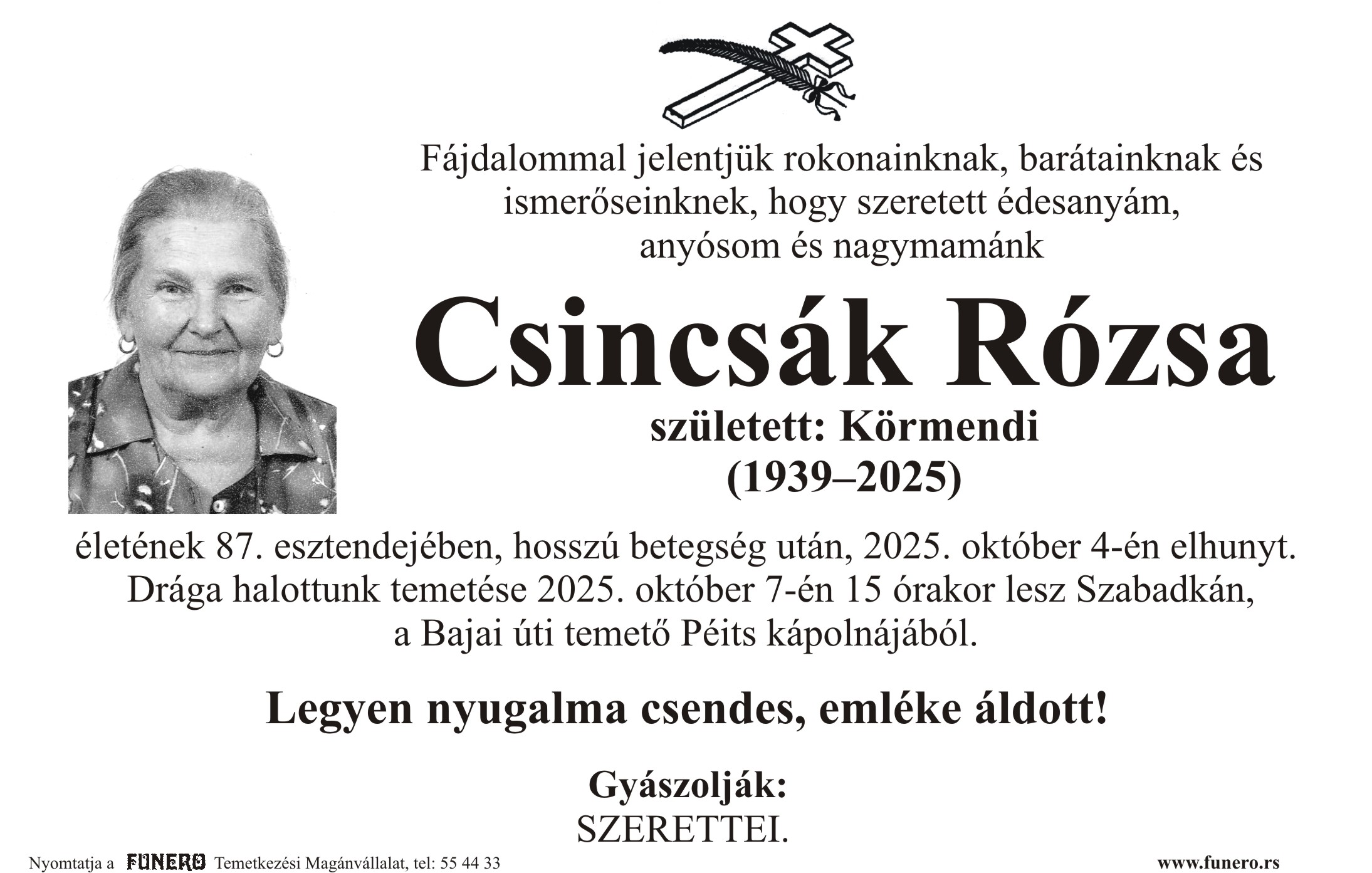 U 86. godini preminula je Roža Činčak iz Kelebije. Sahrana je 7. oktobra u 15 sati na Bajskom groblju iz Peić kapele.