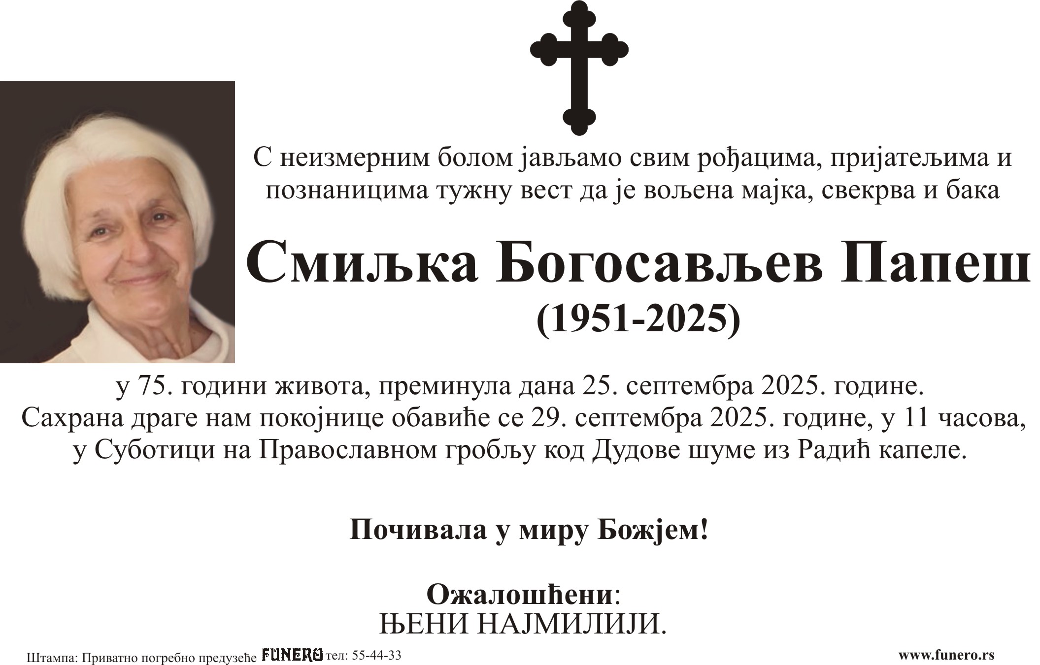 U 74. godini preminula je Smiljka Bogosavljev Papeš iz Subotice, iz Sutjeske ulice. Sahrana je 29. septembra u 11 časova na Pravoslavnom groblju kod Dudove šume iz Radić kapele.