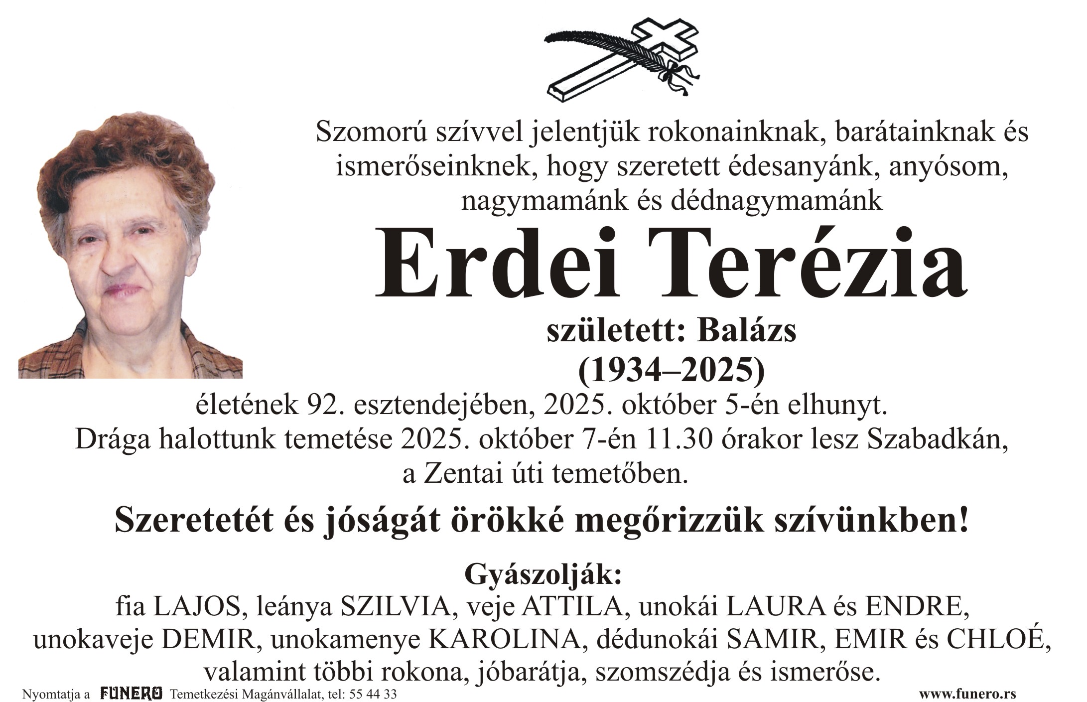 U 91. godini preminula je Terezia Erdei iz Subotice, iz ulice Bose Milićevića. Sahrana je 7. oktobra u 11 sati i 30 minuta na Senćanskom groblju.