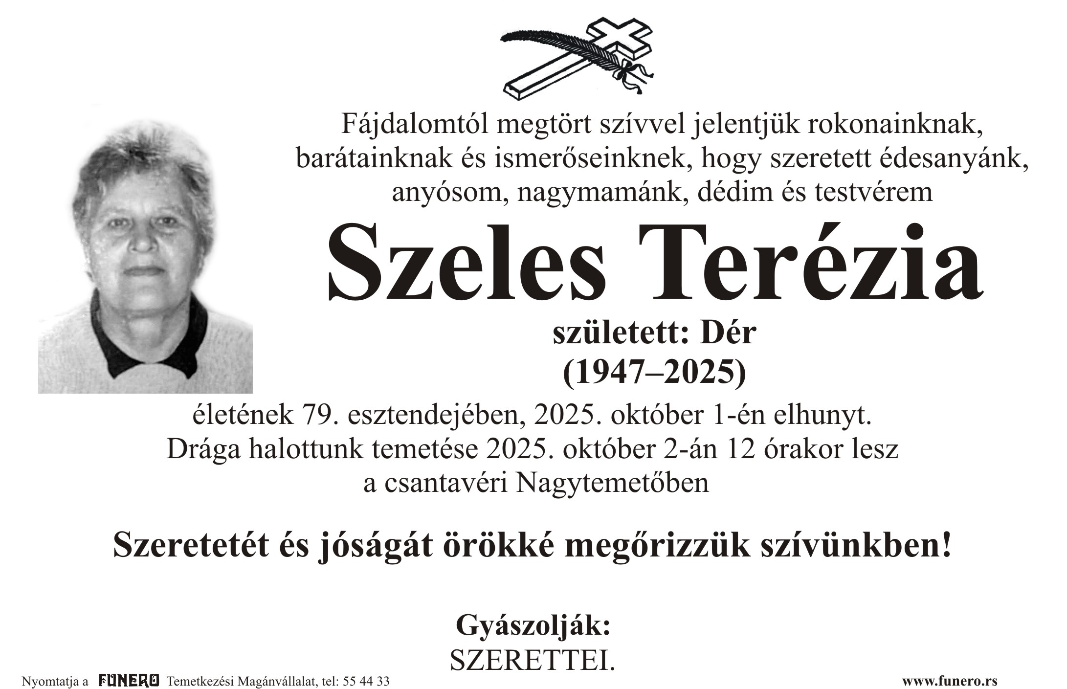 U 78. godini preminula je Terezia Seleš iz Čantavira. Sahrana je 2. oktobra u 12 sati na Velikom groblju u Čantaviru.