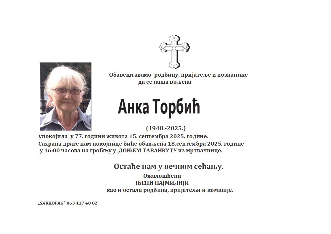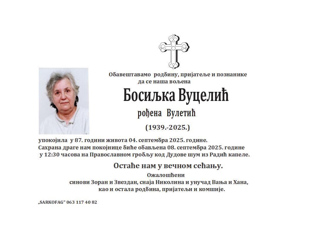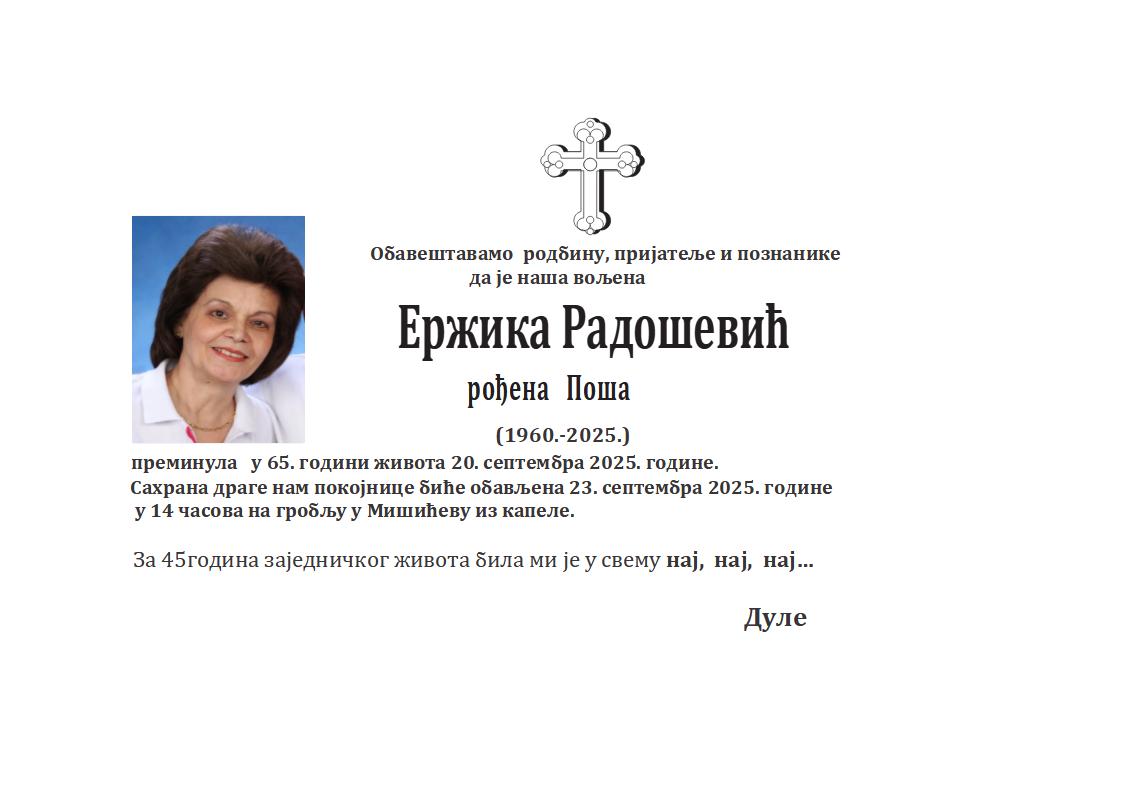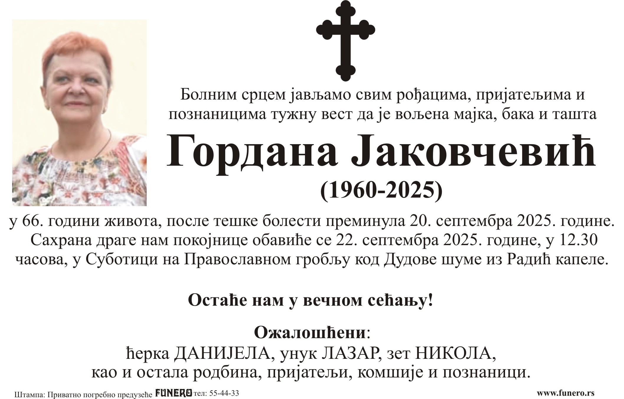U 65. godini preminula je Gordana Jakovčević iz Subotice, iz ulice Nikole Kujundžića. Sahrana je 22. septembra u 12 časova i 30 minuta na Pravoslavnom groblju kod Dudove šume iz Radić kapele.