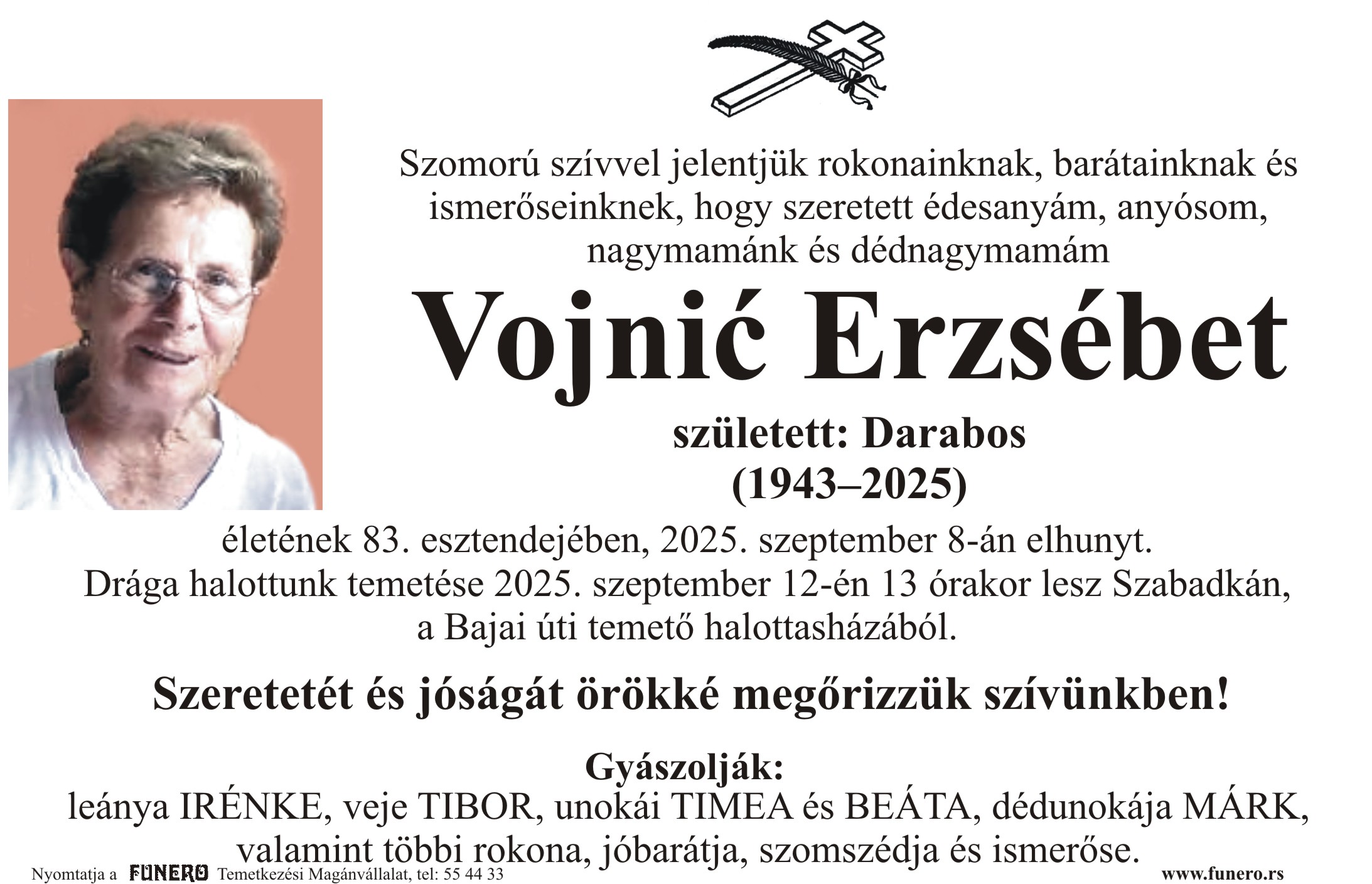 U 82. godini preminula je Eržebet Vojnić iz Subotice, iz Podgorske ulice. Sahrana je 12. septembra u 13 sati na Bajskom groblju iz mrtvačnice.