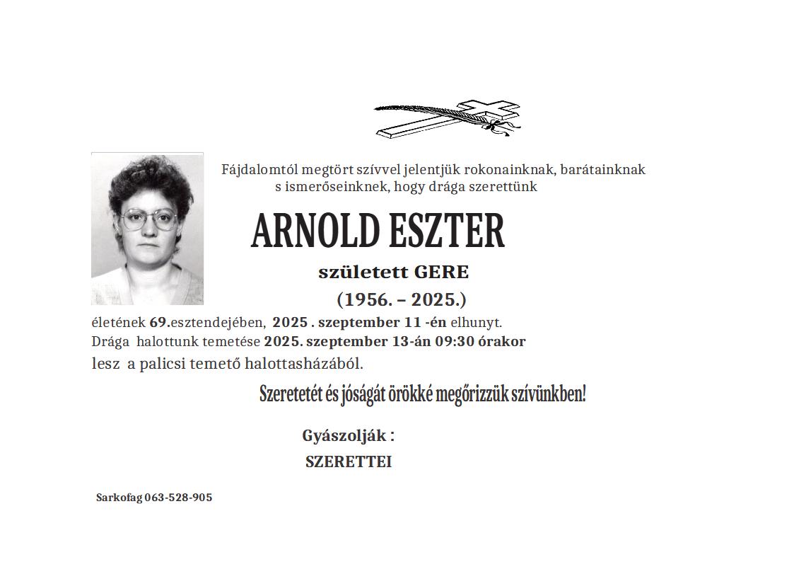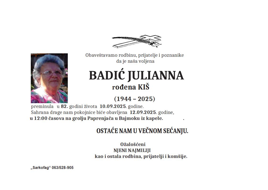 U 81. godini preminula je Magdolna Kopunović iz Pačira, iz ulice Đerđa Dože. Sahrana je 11. septembra u 13 sati na Bajskom groblju iz mrtvačnice.