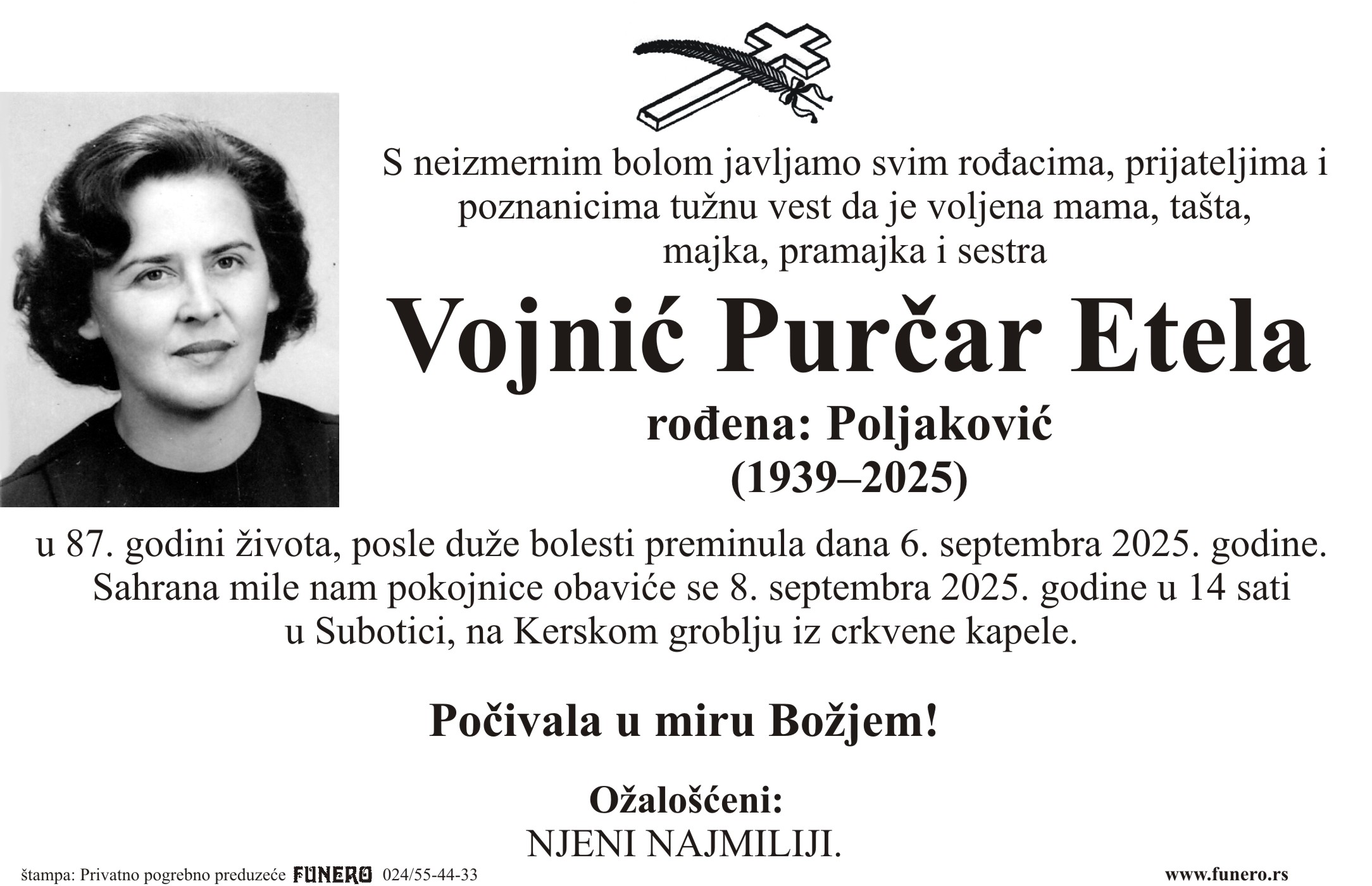 U 86. godini preminula je Etela Vojnić Purčar iz Subotice, iz Moravske ulice. Sahrana je 8. septembra u 14 sati na Kerskom groblju iz crkvene kapele.