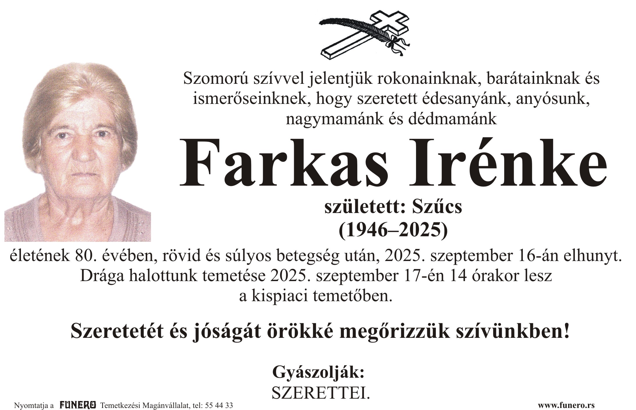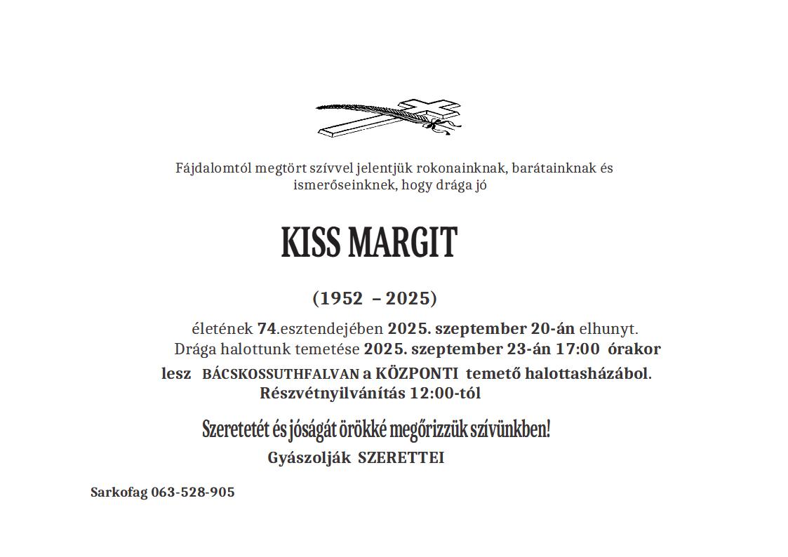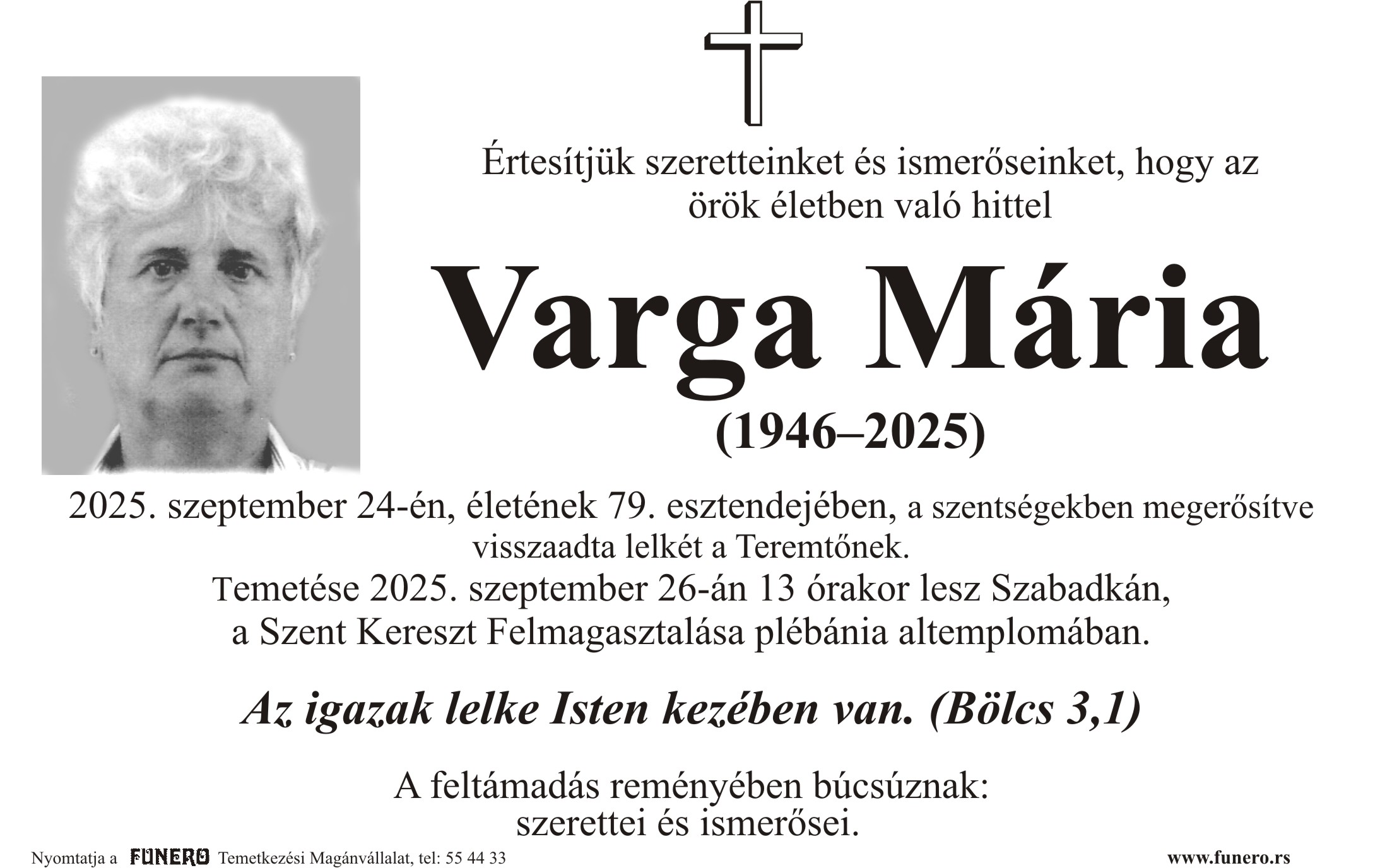 U 79. godini preminula je Maria Varga iz Subotice. Sahrana je 26. septembra u 13 sati u crkvi Uzvišenja svetog Križa.