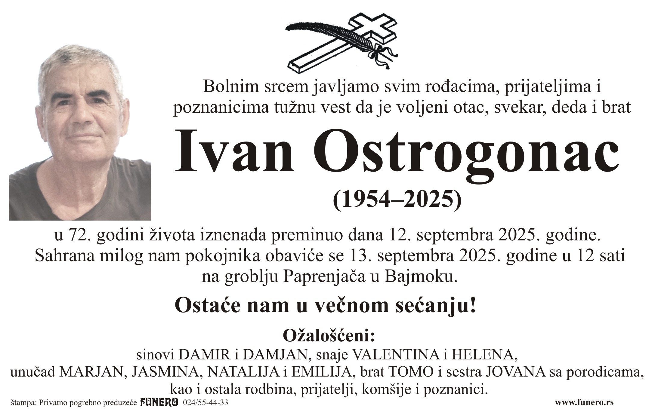 U 71. godini preminuo je Ivan Ostrogonac iz Bajmoka, iz 11. nove ulice. Sahrana je 13. septembra u 12 sati na groblju Paprenjača u Bajmoku.