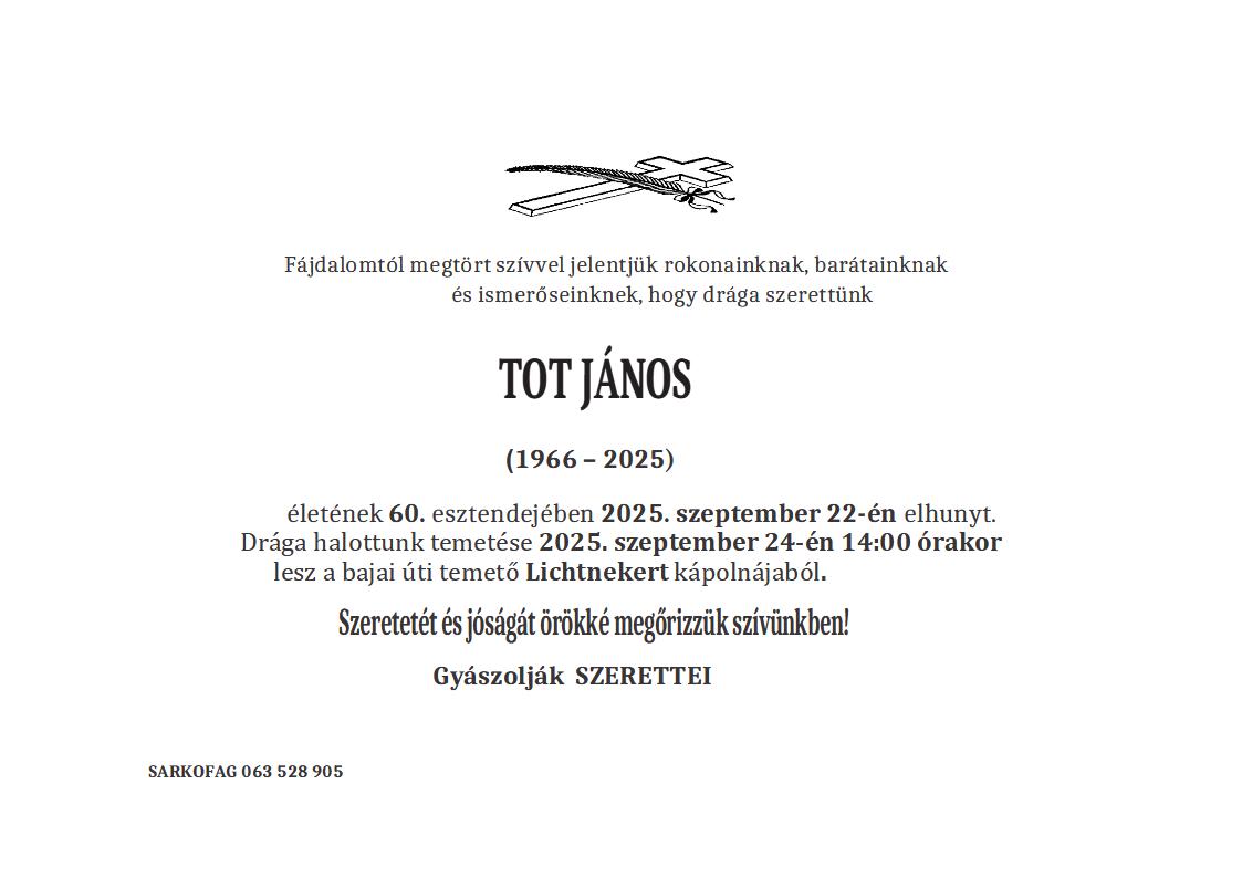 U 55. godini preminuo je Peter Tukač iz Subotice, iz Jorgovanske ulice. Sahrana je 18. septembra u 14 sati na groblju u Bačkim Vinogradima.