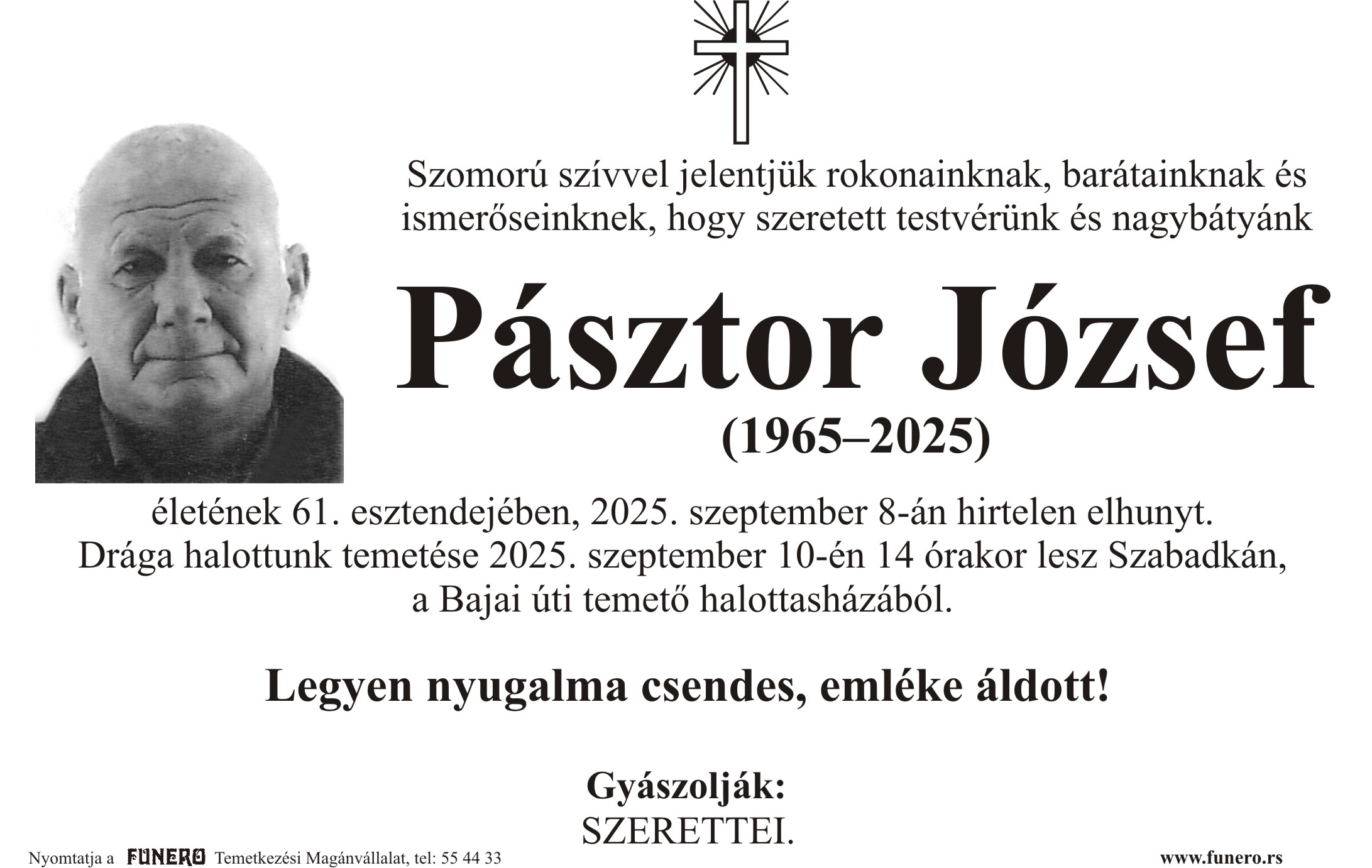 U 60. godini preminuo je Jožef Pastor iz Subotice, iz ulice Luke Perkovića. Sahrana je 10. septembra u 14 sati na Bajskom groblju iz mrtvačnice.