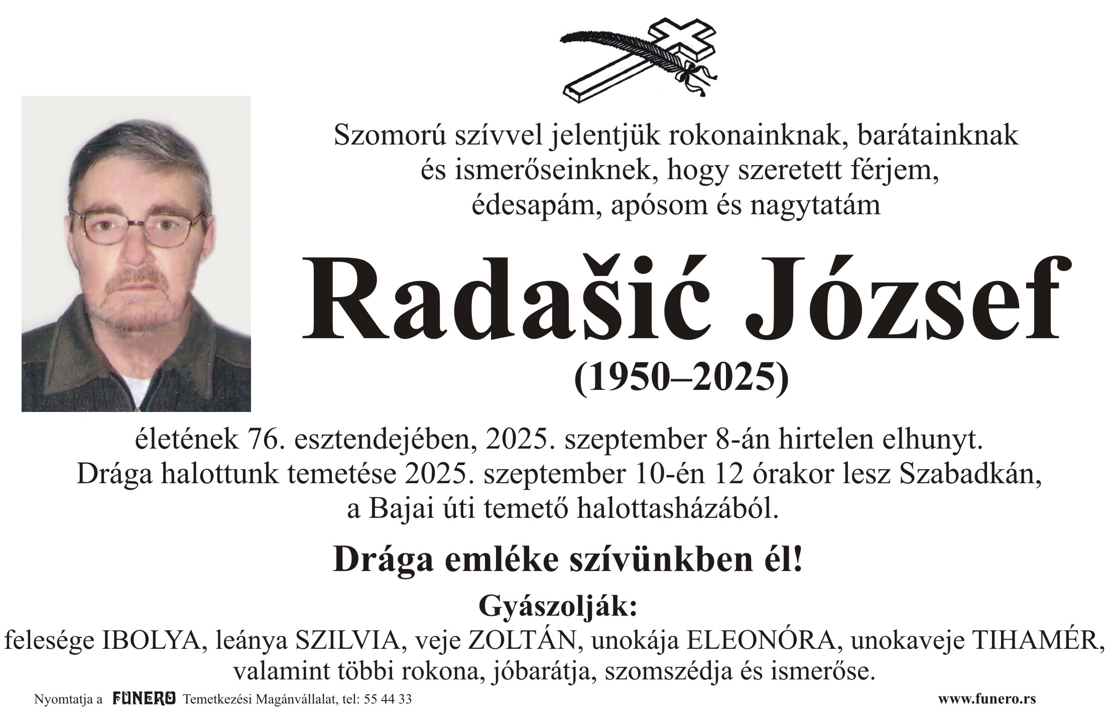 U 75. godini preminuo je Jožef Radašić iz Subotice, iz Slavonske ulice. Sahrana je 10. septembra u 12 sati na Bajskom groblju iz mrtvačnice.