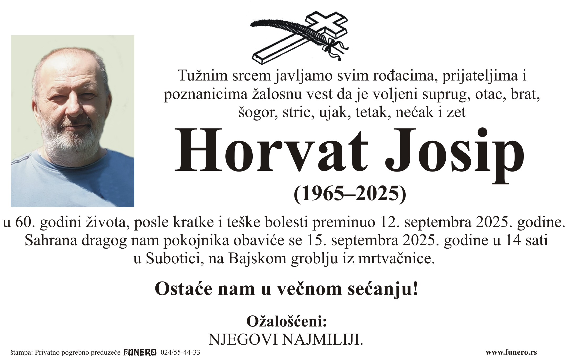 U 60. godini preminuo je Josip Horvat iz Subotice, iz ulice Antuna Suturovića. Sahrana je 15. septembra u 14 sati na Bajskom groblju iz mrtvačnice.