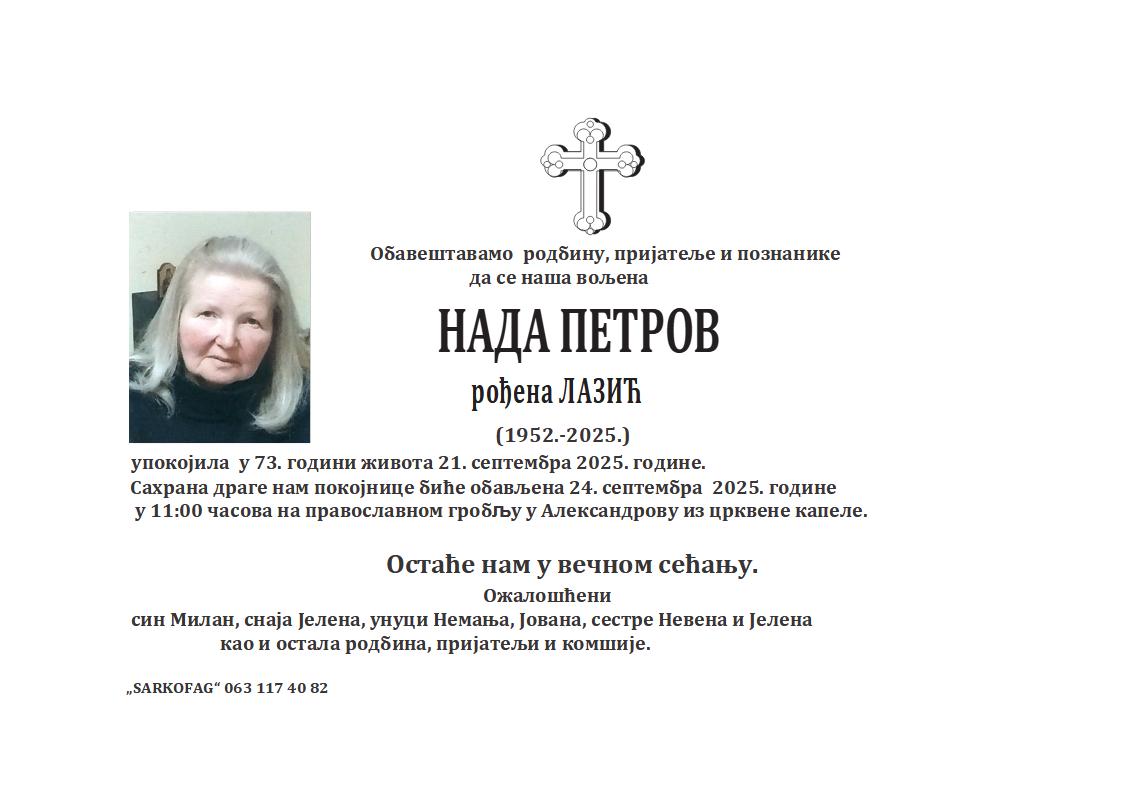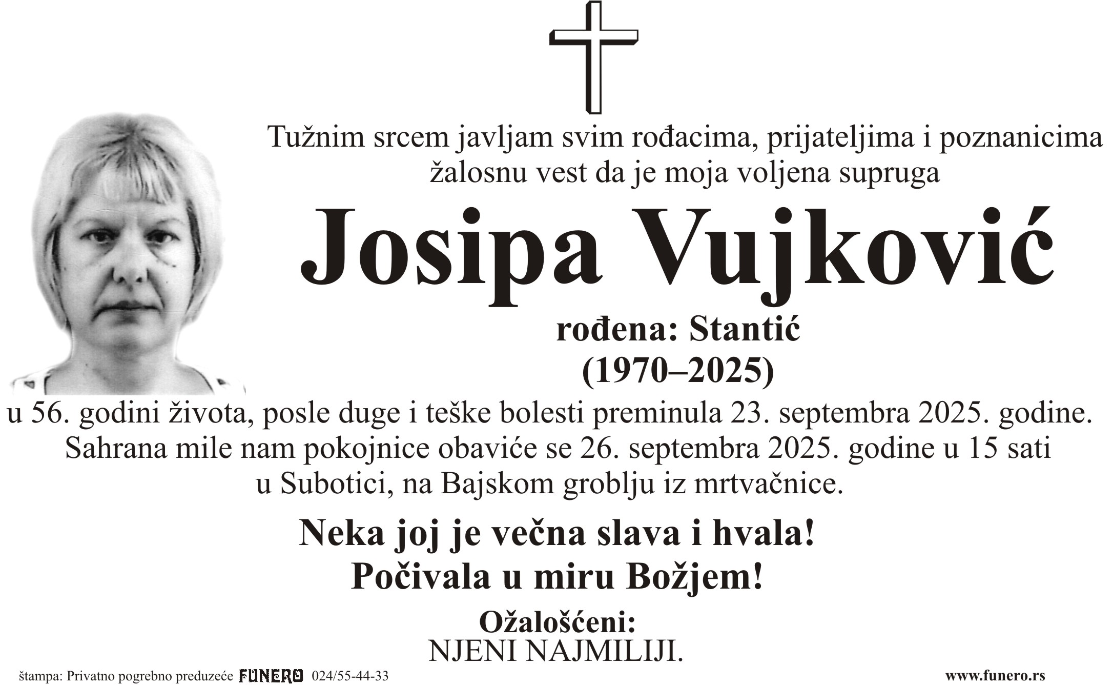 U 55. godini preminula je Josipa Vujković iz Subotice, iz ulice Proleterskih brigada. Sahrana je 26. septembra u 15 sati na Bajskom groblju iz mrtvačnice.