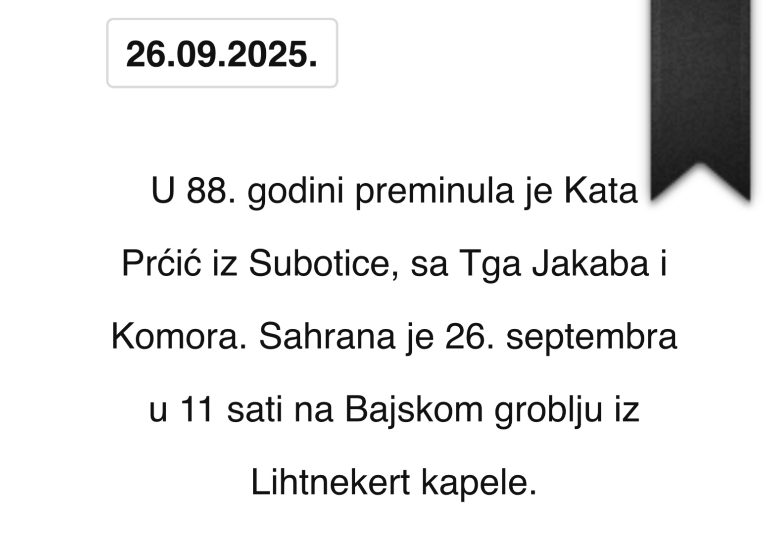 U 88. godini preminula je Kata Prćić iz Subotice, sa Tga Jakaba i Komora. Sahrana je 26. septembra u 11 sati na Bajskom groblju iz Lihtnekert kapele.