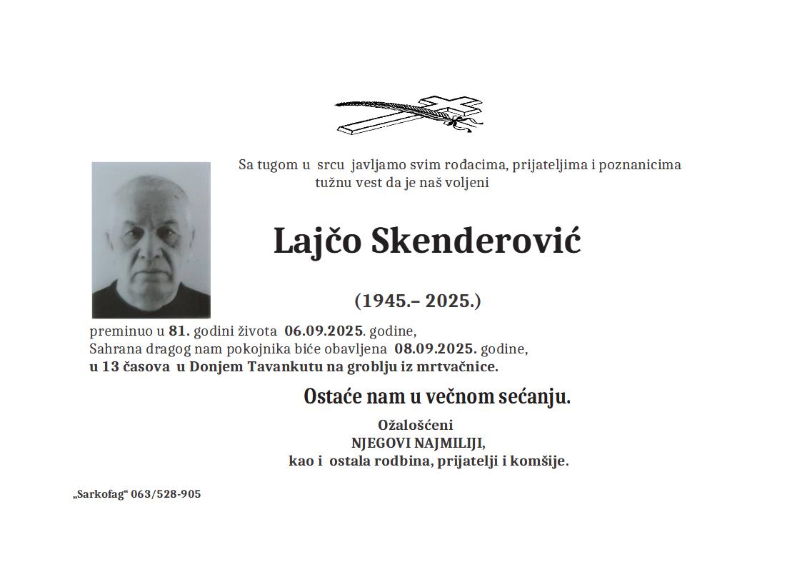 U 81. godini preminuo je Šandor Galfi iz Gornjeg Tavankuta. Sahrana je 20. septembra u 14 sati na groblju u Donjem Tavankutu.