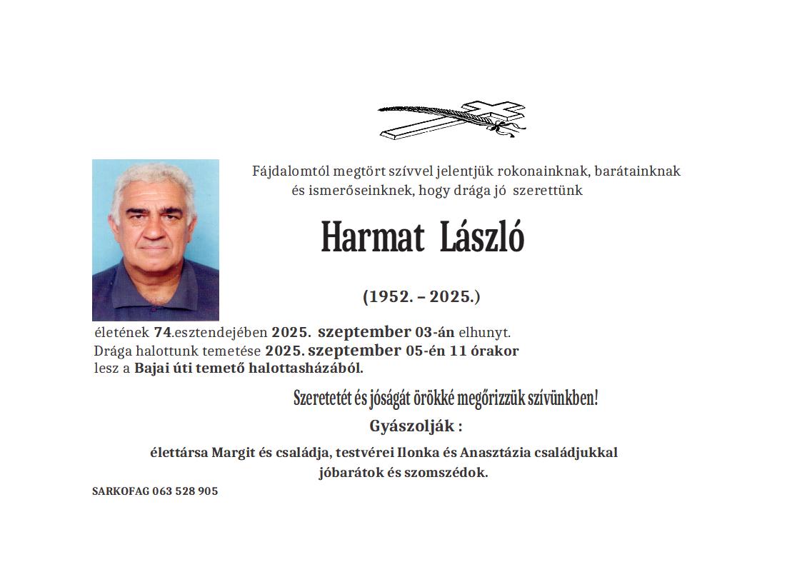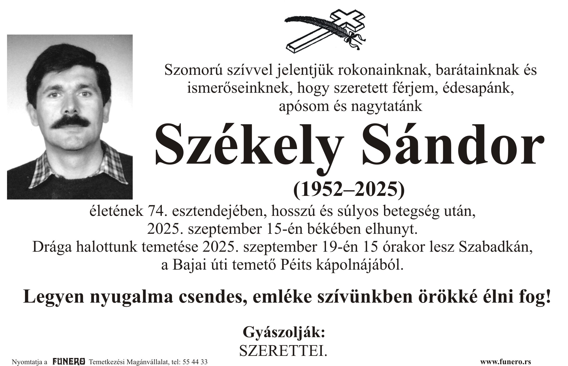 U 76. godini preminuo je Zoltan Šipoš iz Subotice, iz ulice Edvina Zdovca. Sahrana je 27. septembra u 12 sati na Bajskom groblju iz mrtvačnice.