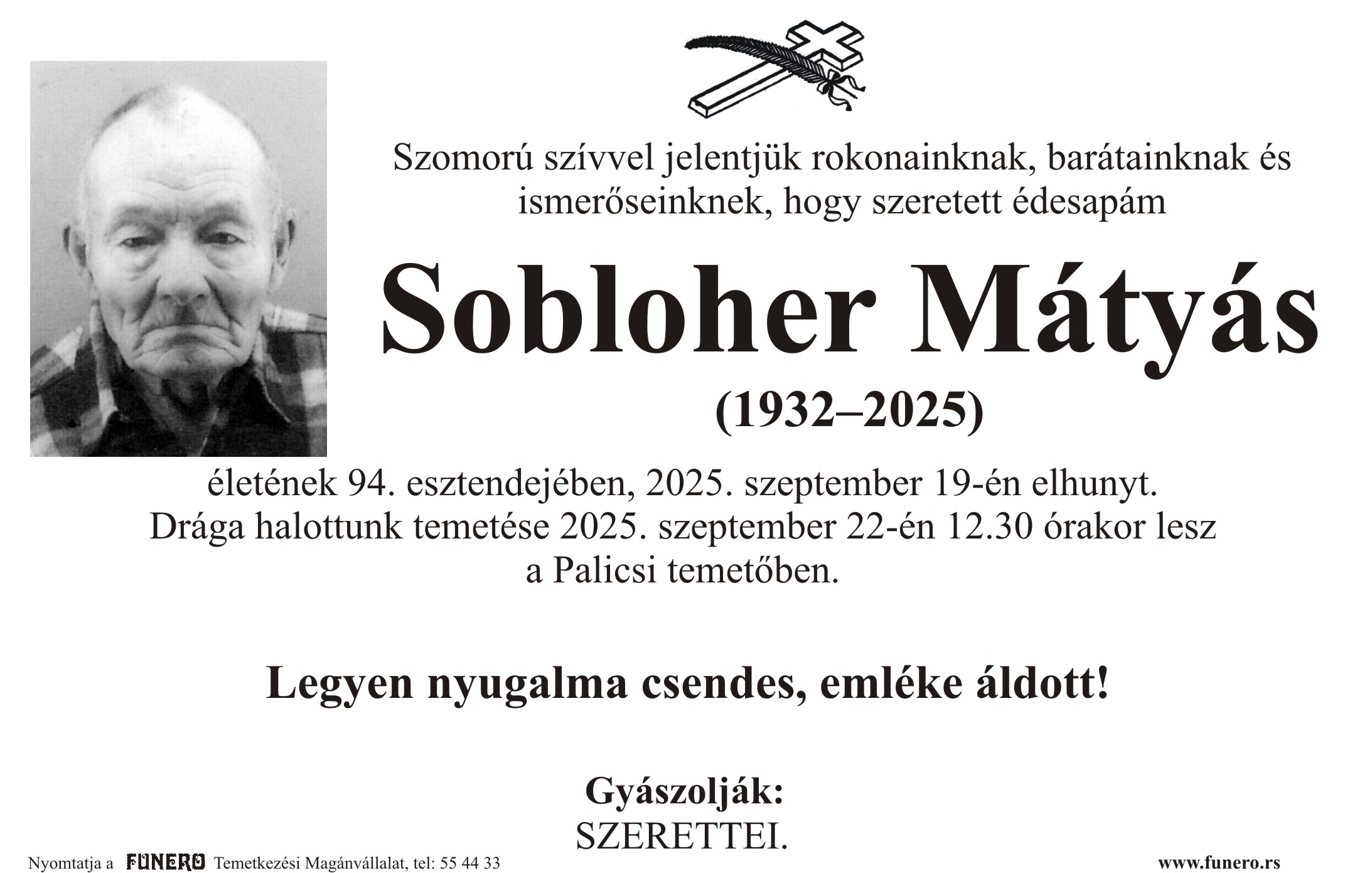 U 93. godini preminuo je Maćaš Šobloher sa Palića, sa Kanjiškog puta. Sahrana je 22. septembra u 12 sati i 30 minuta na Palićkom groblju.